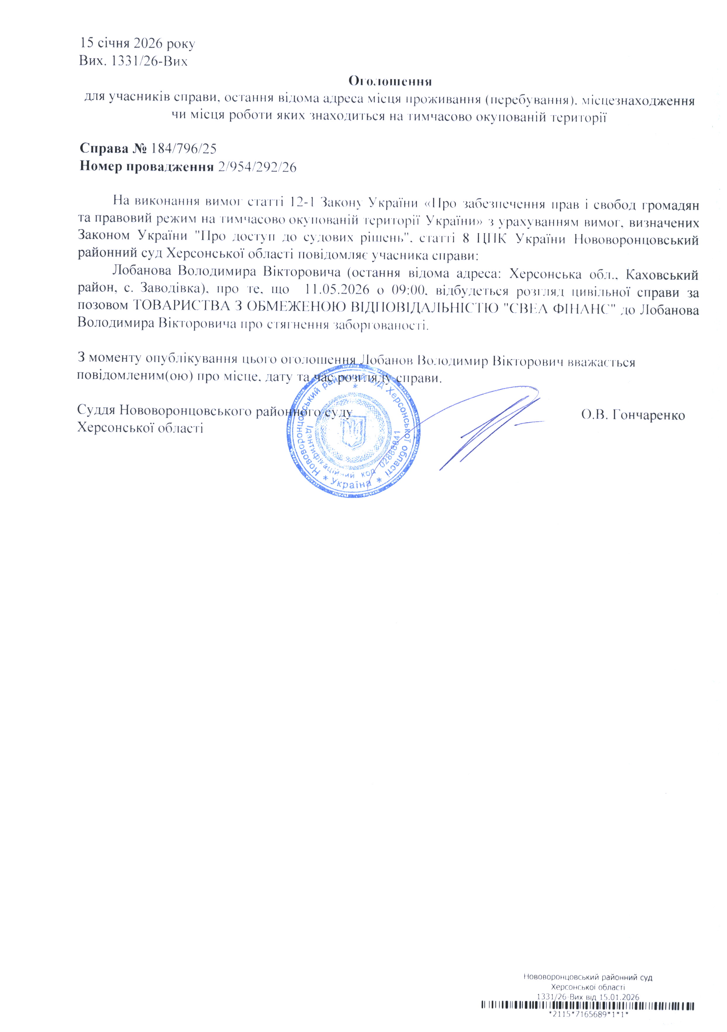 До суду викликається Лобанов Володимир Вікторович на 9 год. 00 хв. 11 травня 2026 року