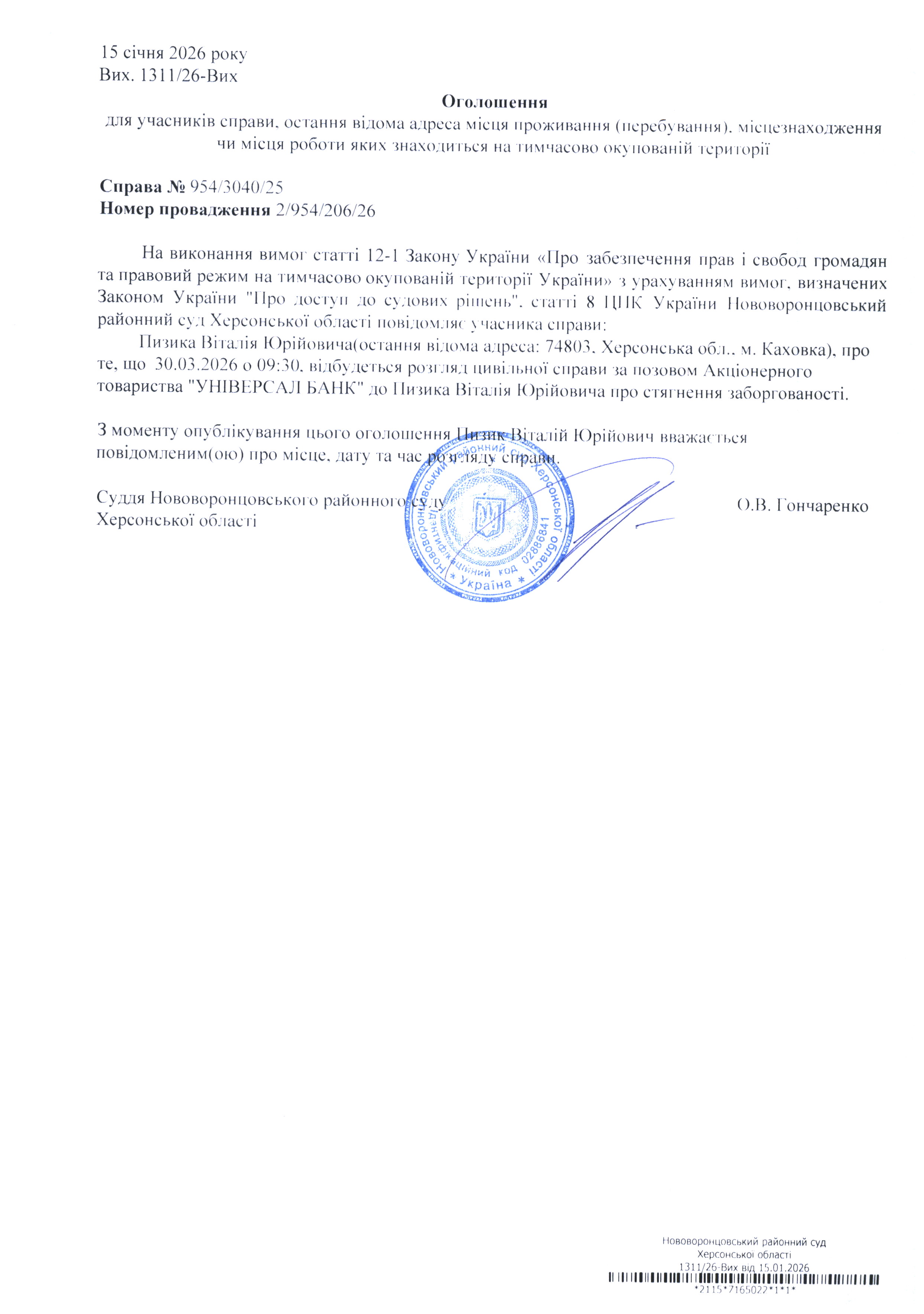 До суду викликається Пизик Віталій Юрійович на 9 год. 30 хв. 30 березня 2026 року