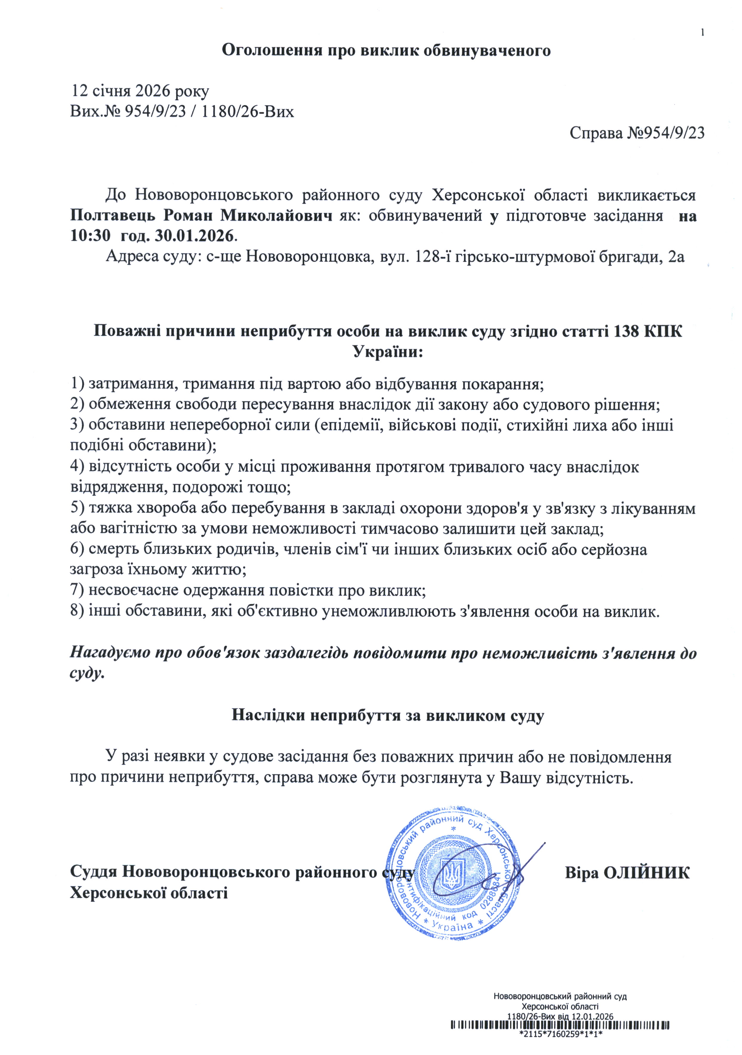 До суду викликається Полтавець Роман Миколайович на 10 год. 30 хв. 30 січня 2026 року