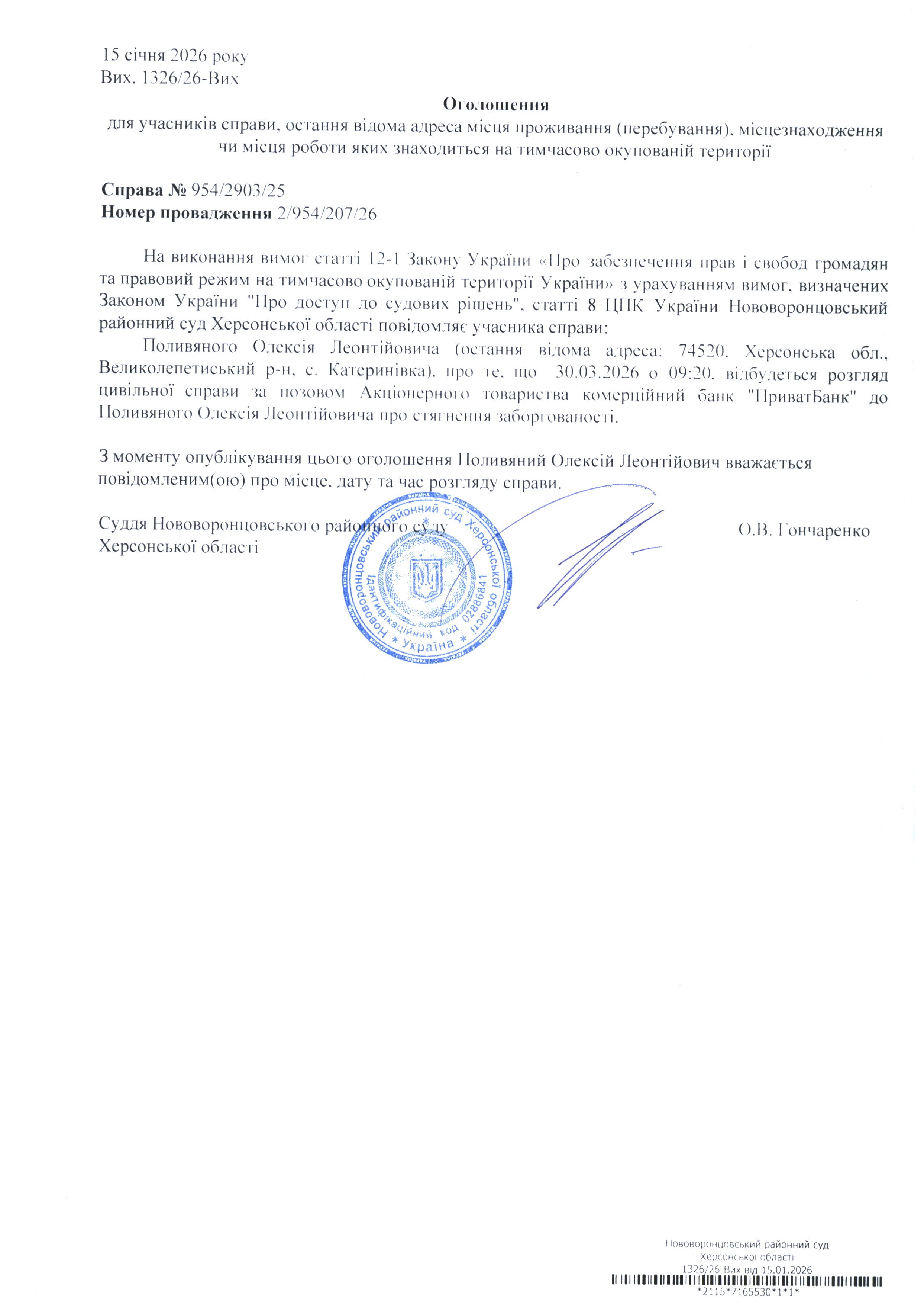 До суду викликається Поливяний Олексій Леонтійович на 9 год. 20 хв. 30 березня 2026 року