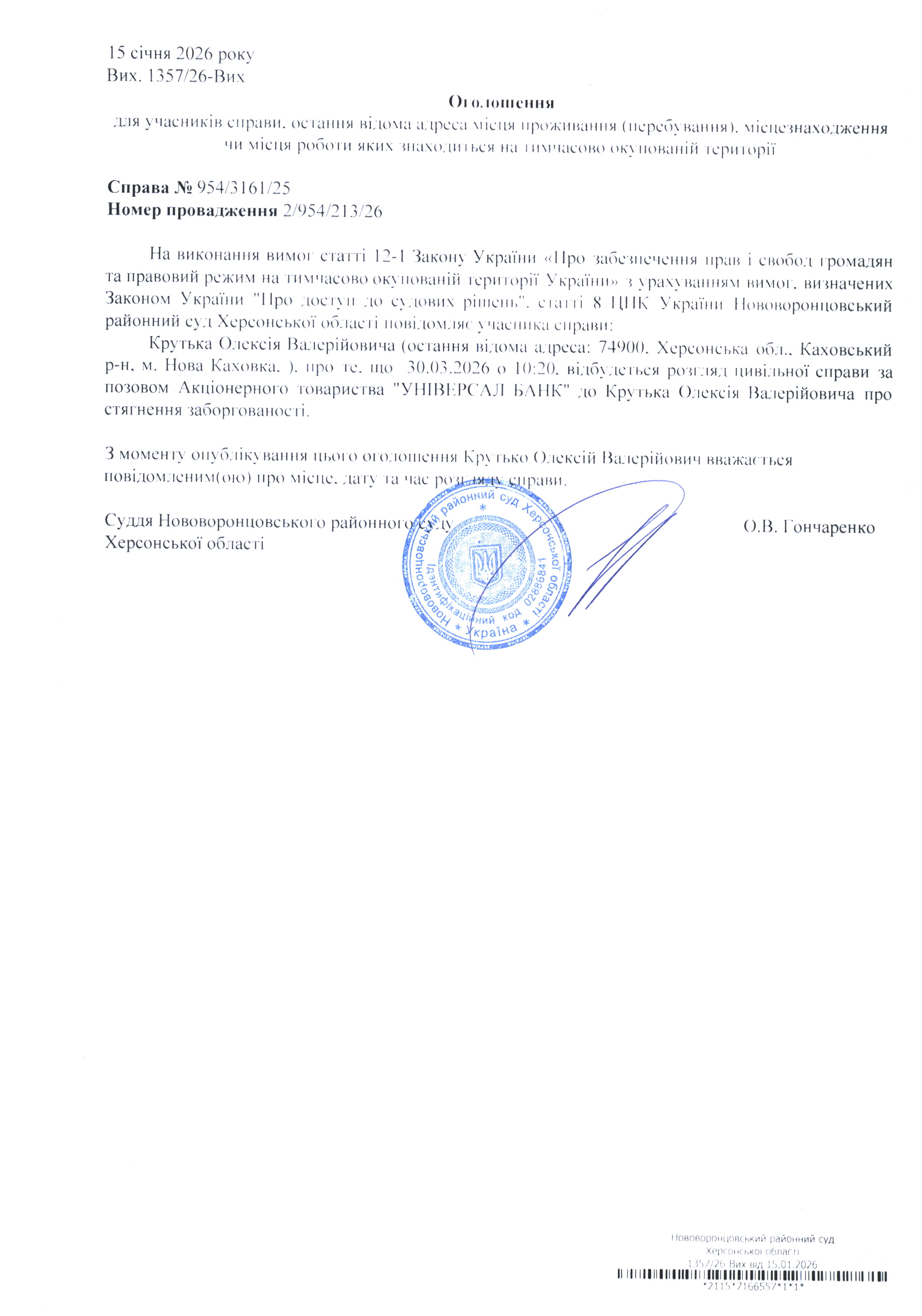 До суду викликається Крутько Олексій Валерійович на 10 год. 20 хв. 30 березня 2026 року