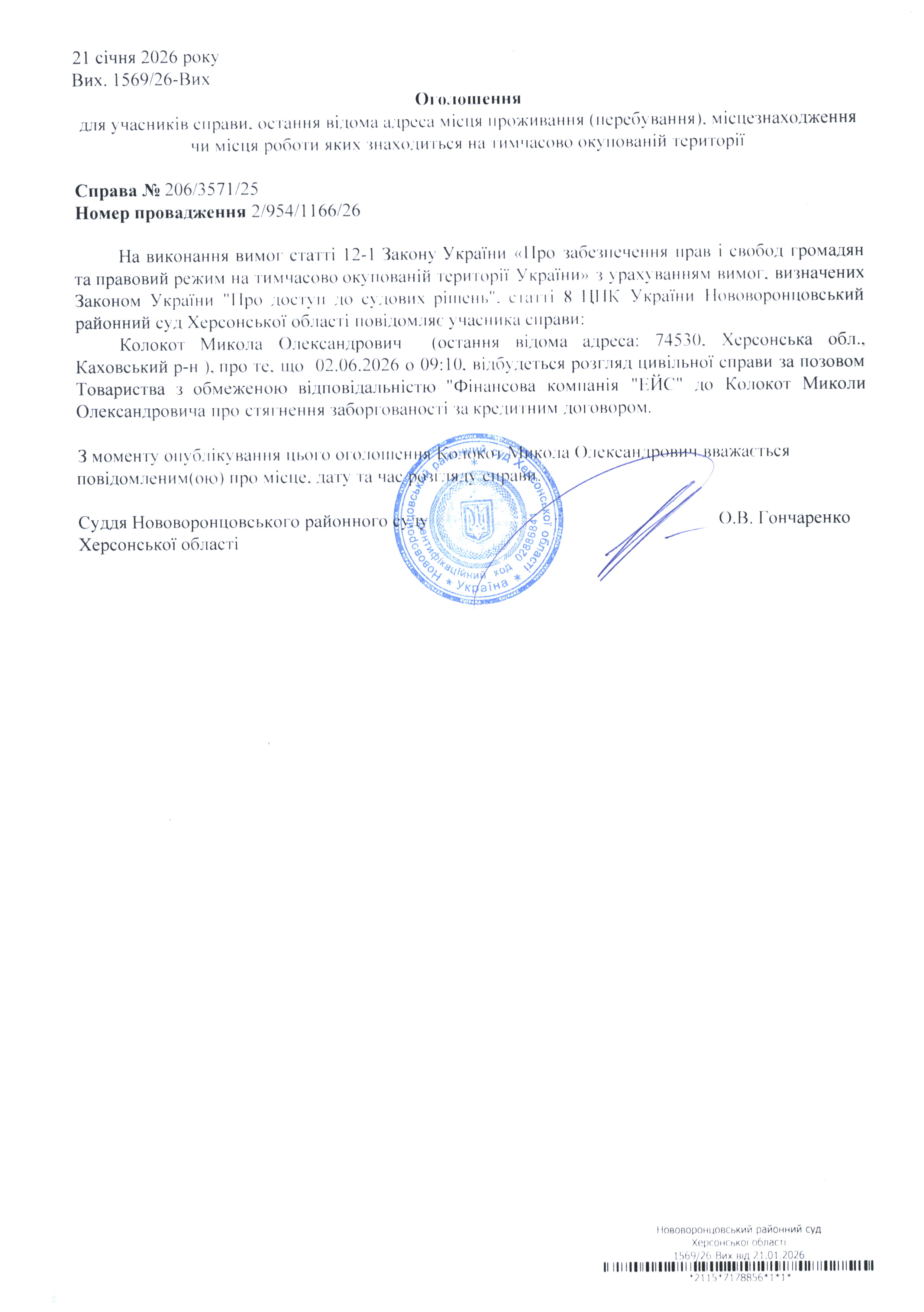 До суду викликається Колокот Микола Олександрович на 9 год. 10 хв. 2 червня 2026 року
