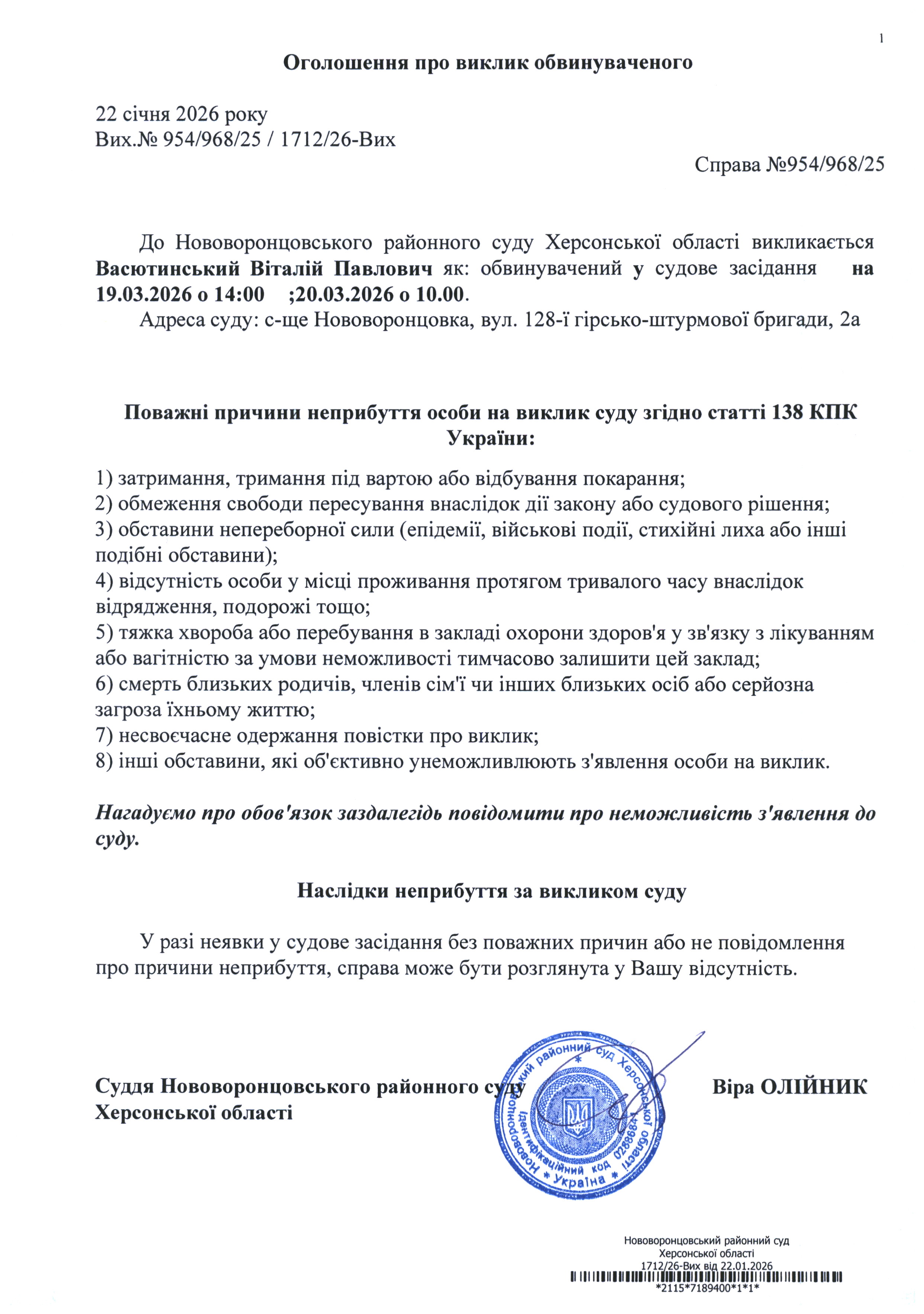 До суду викликається Васютинський Віталій Павлович на 14 год. 00 хв. 19 березня та на 10 год. 00 хв. 20 березня 2026 року