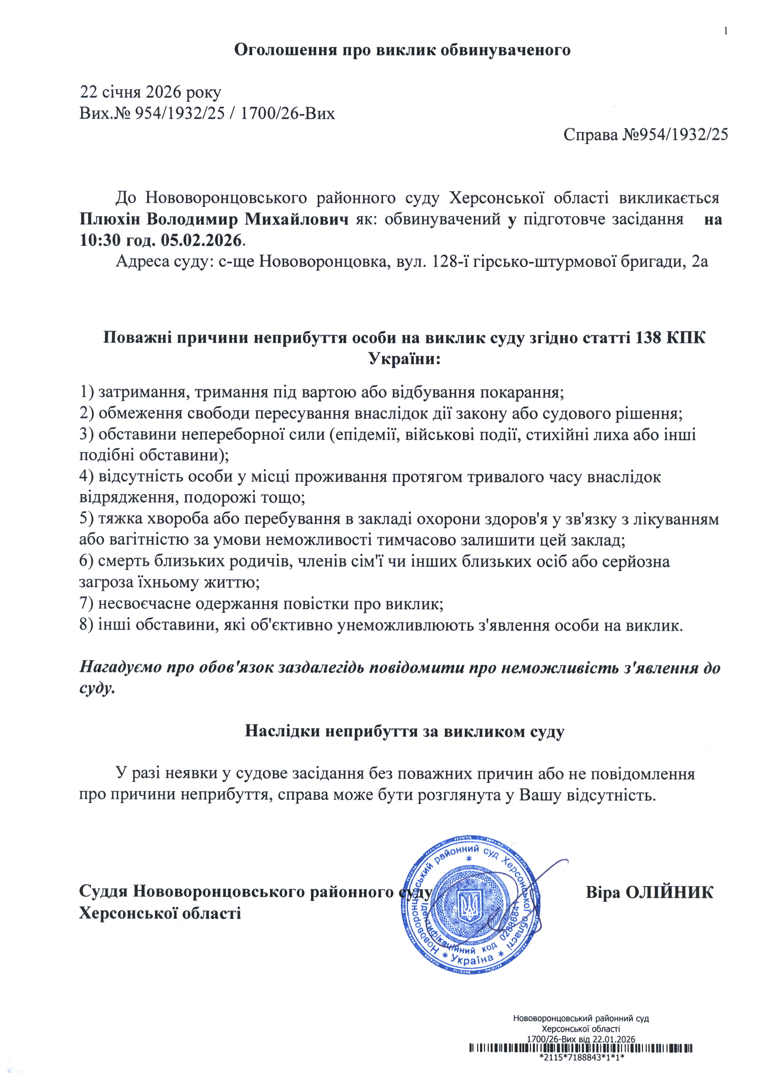 До суду викликається Плюхін Володимир Михайлови на 10 год. 30 хв. 5 лютого 2026 року
