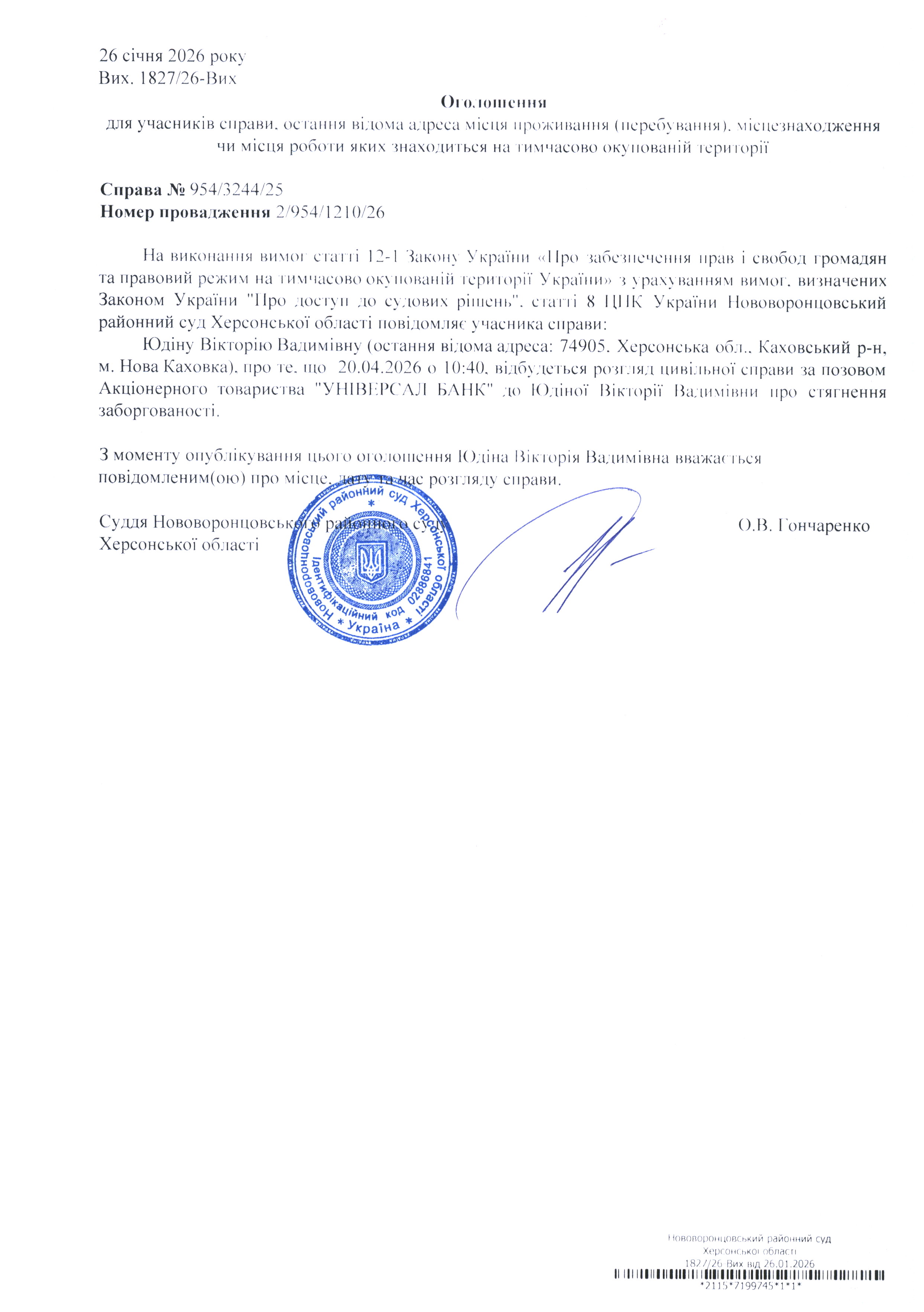 До суду викликається Юдіна Вікторія Вадимівна на 10 год. 40 хв. 20 квітня 2026 року