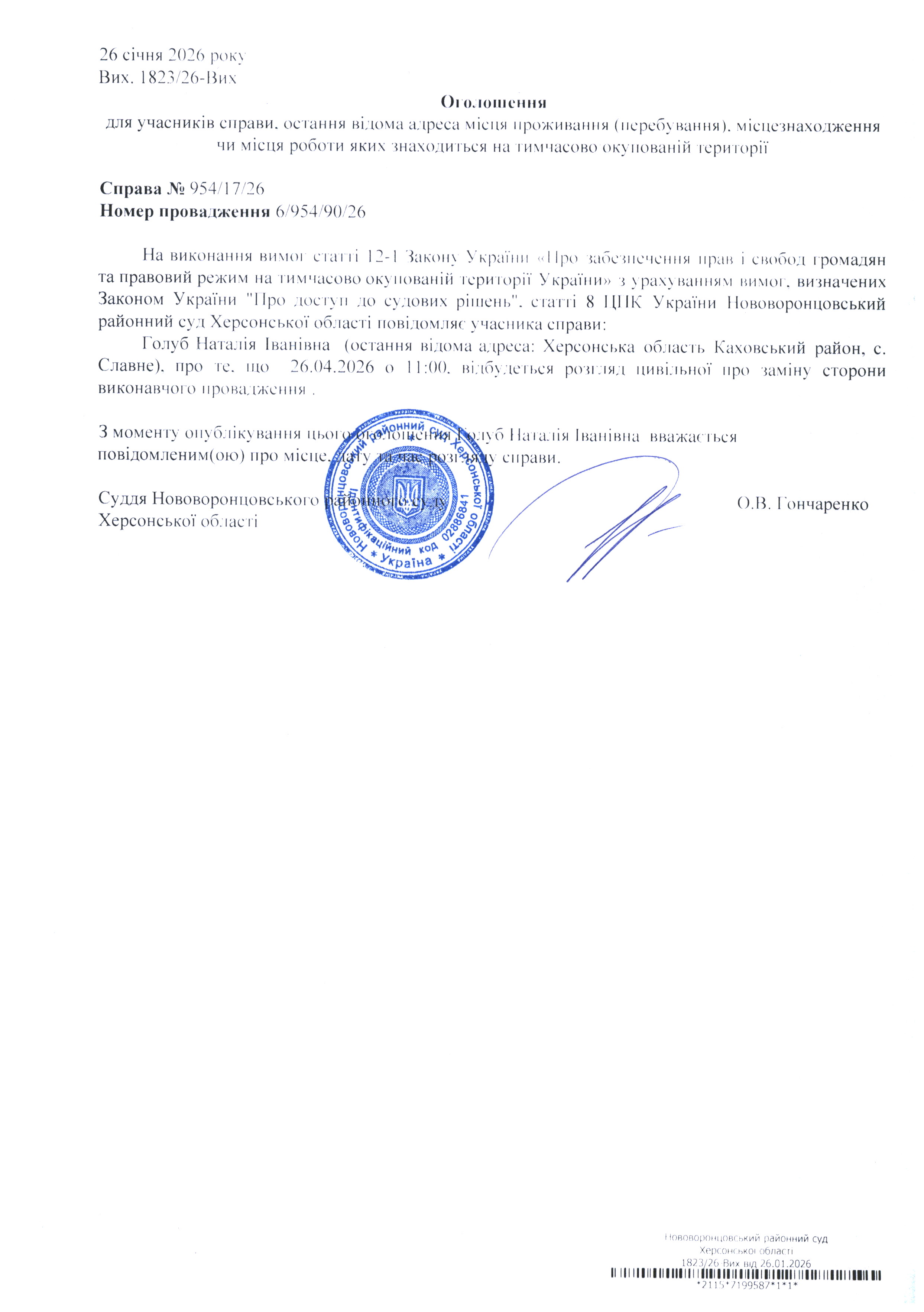 До суду викликається Голуб Наталія Іванівна на 11 год. 00 хв. 26 квітня 2026 року