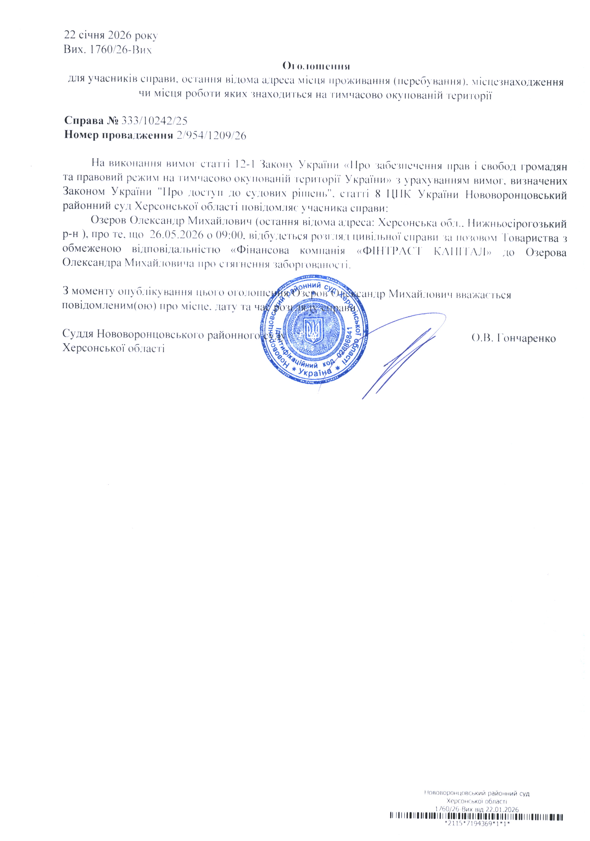 До суду викликається Озеров Олександр Михайлович на 9 год. 00 хв. 26 травня 2026 року