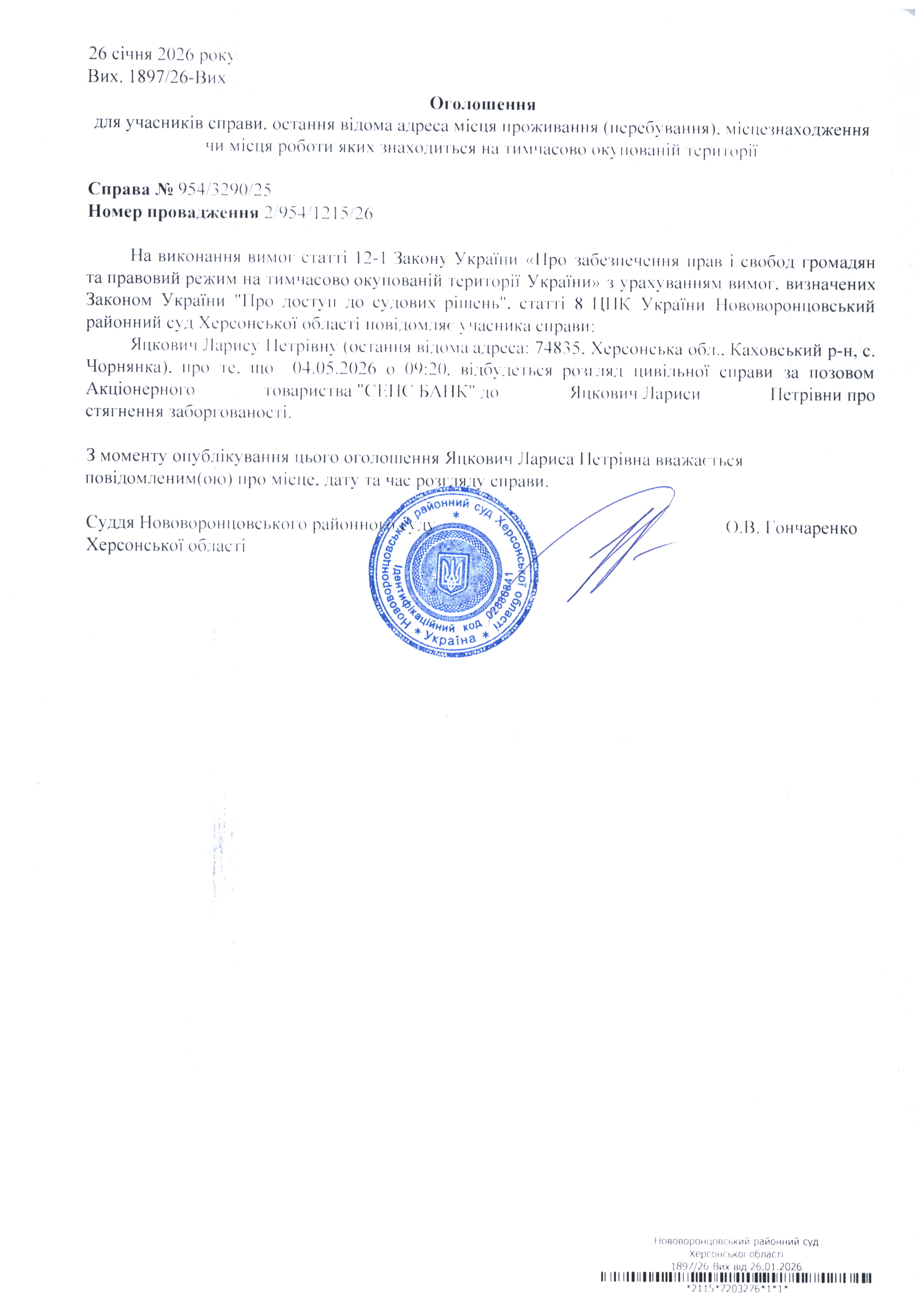 До суду викликається Яцкович Лариса Петрівна на 9 год. 20 хв. 4 травня 2026 року