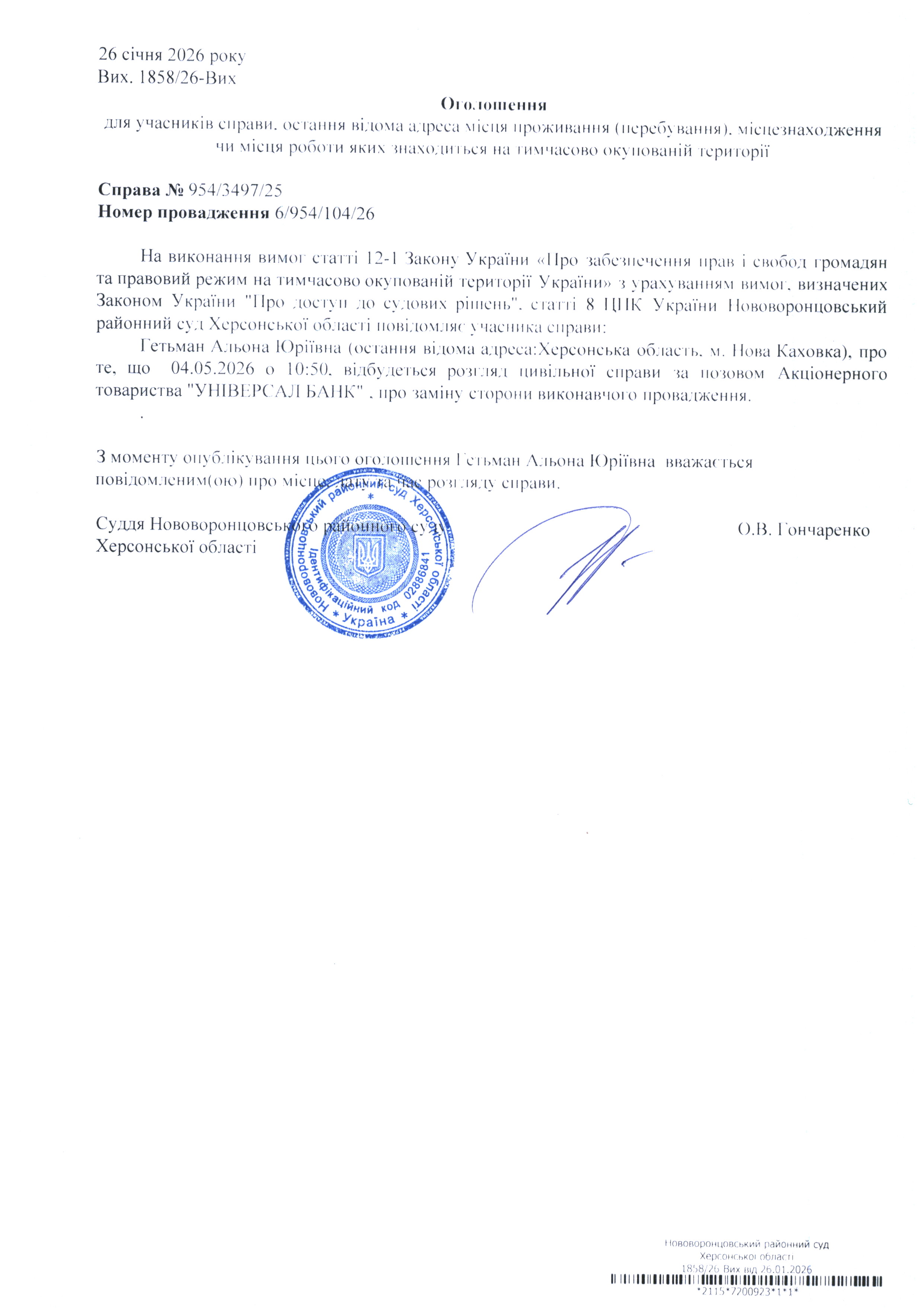 До суду викликається Гетьман Альона Юріївна на 10 год. 50 хв. 4 травня 2026 року