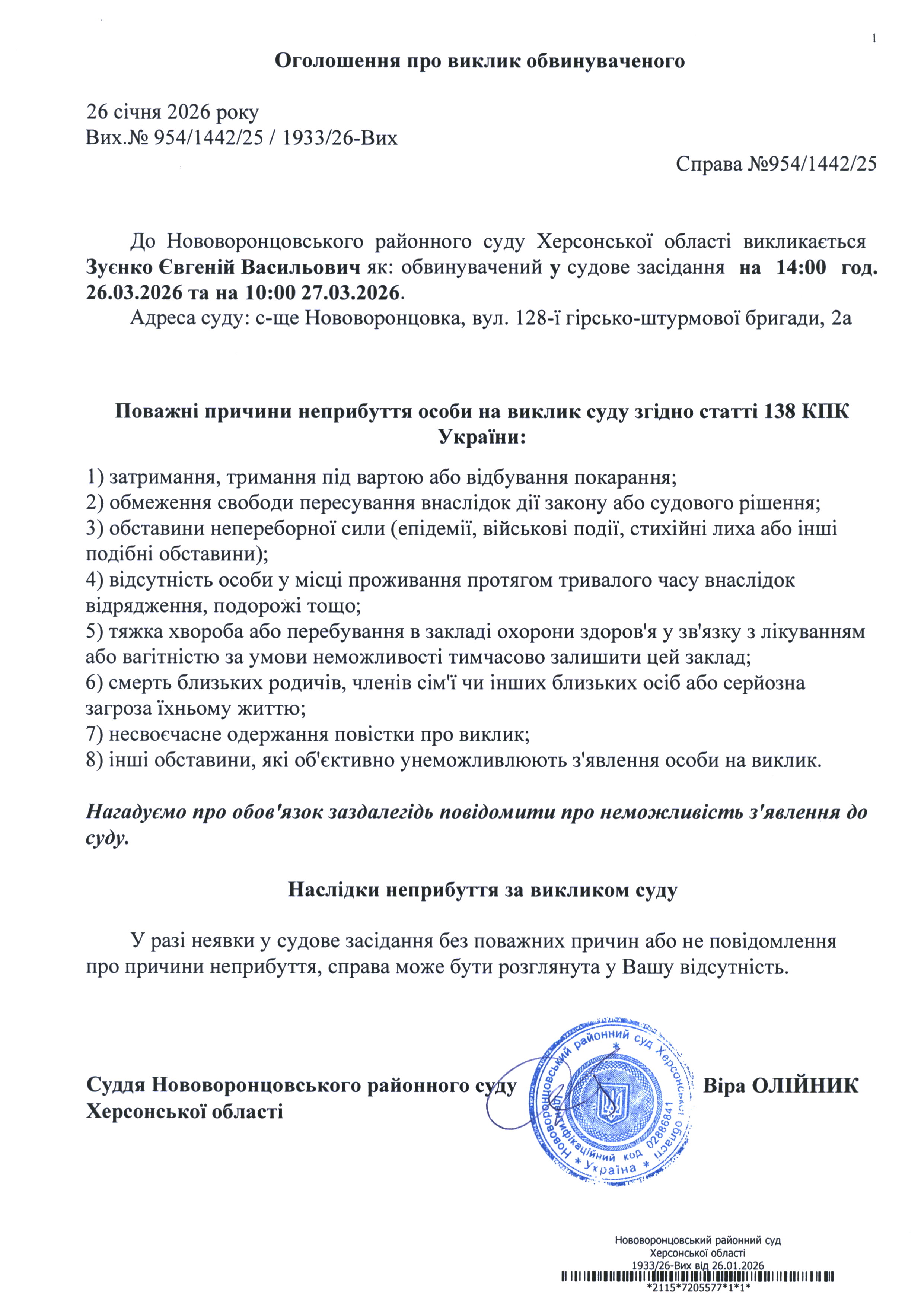 До суду викликається Зуєнко Євгеній Васильович на 14 год. 00 хв. 26 березня та на 10 год. 00 хв. 27 березня 2026 року