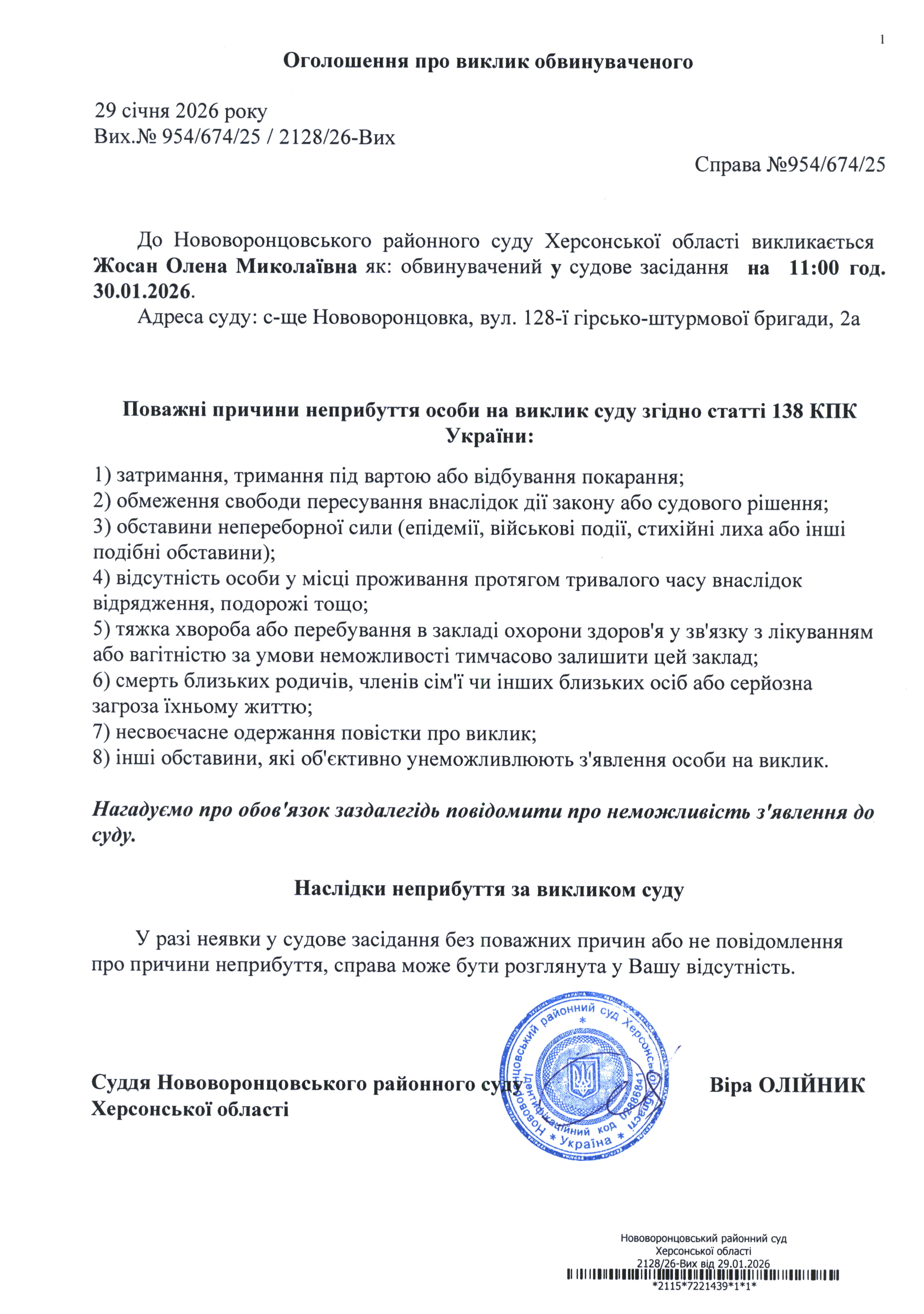 До суду викликається Жосан Олена Миколаївна на 11 год. 00 хв. 30 січня 2026 року