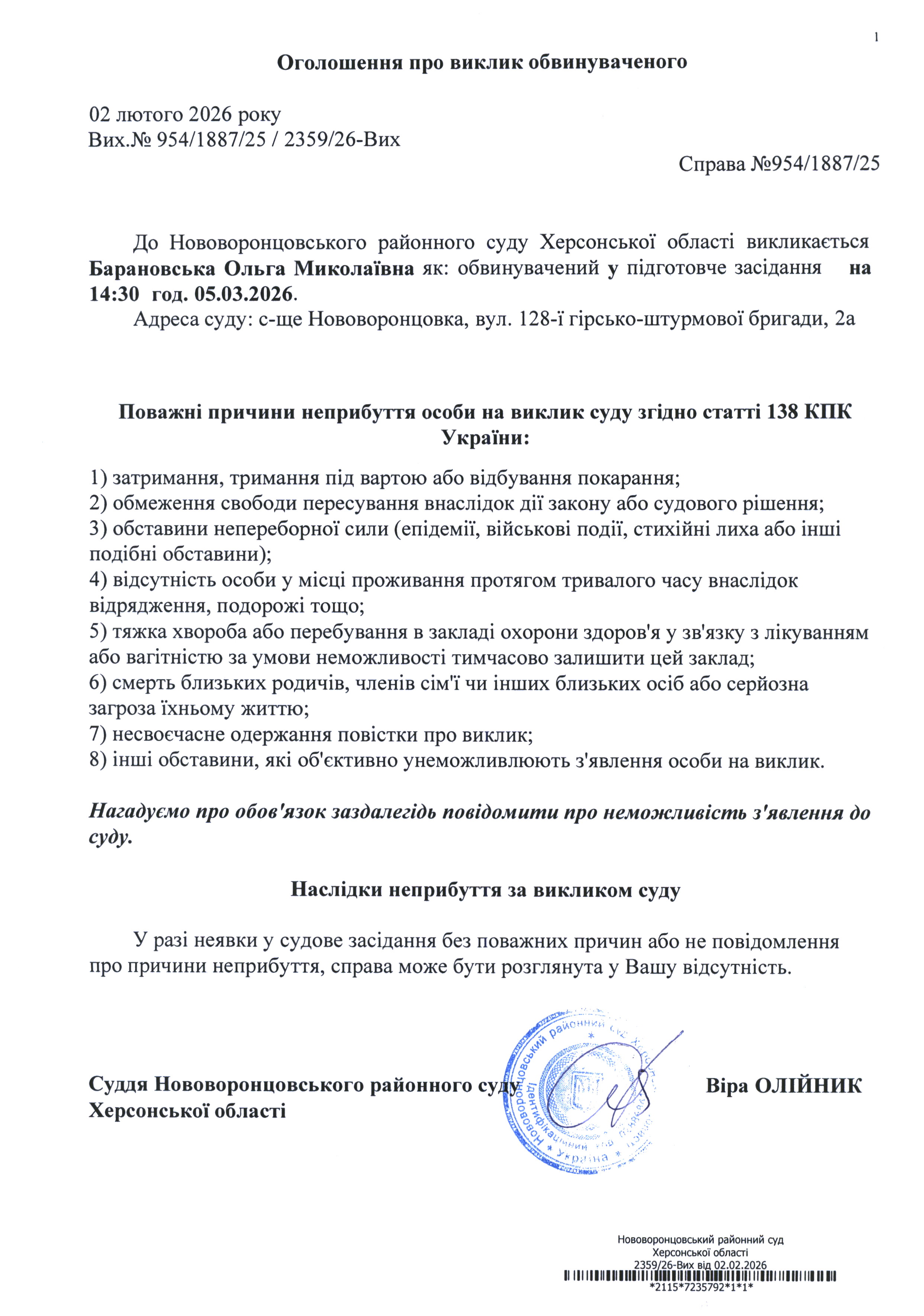 До суду викликається Барановська Ольга Миколаївна на 14 год. 30 хв. 5 березня 2026 року