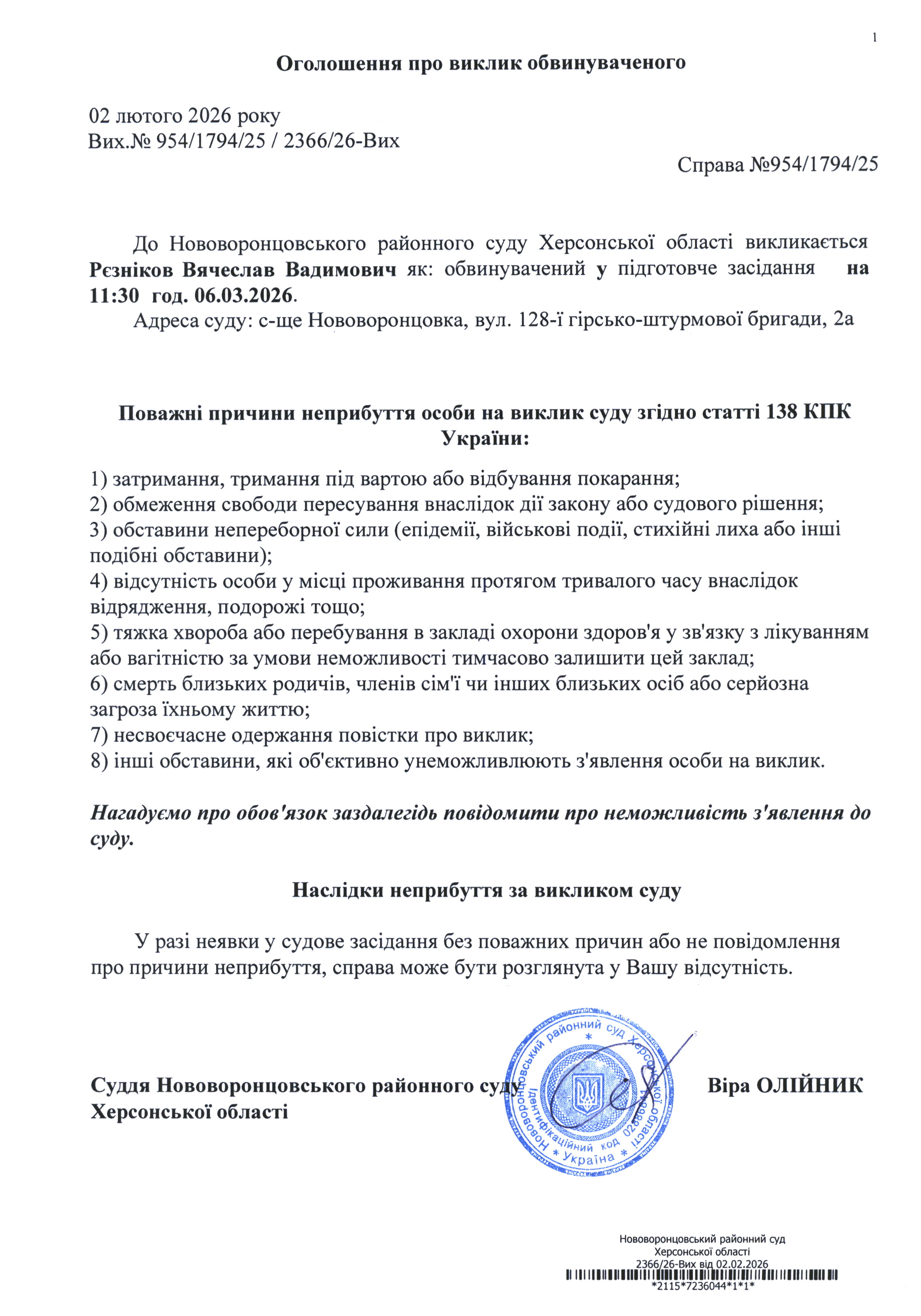 До суду викликається Рєзніков Вячеслав Вадимович на 11 год. 30 хв. 6 березня 2026 року