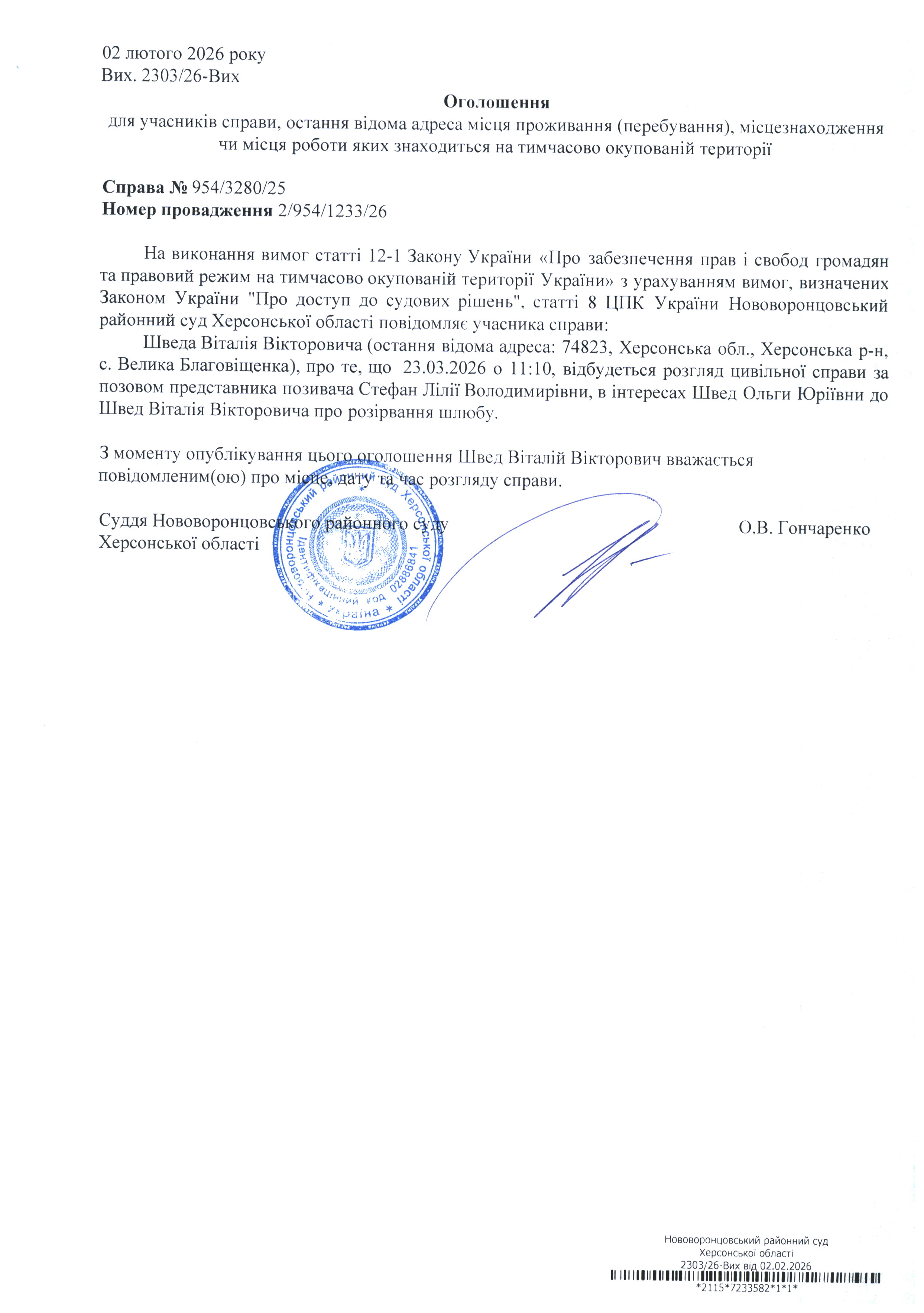 До суду викликається Швед Віталій Вікторович на 11 год. 10 хв. 23 березня 2026 року