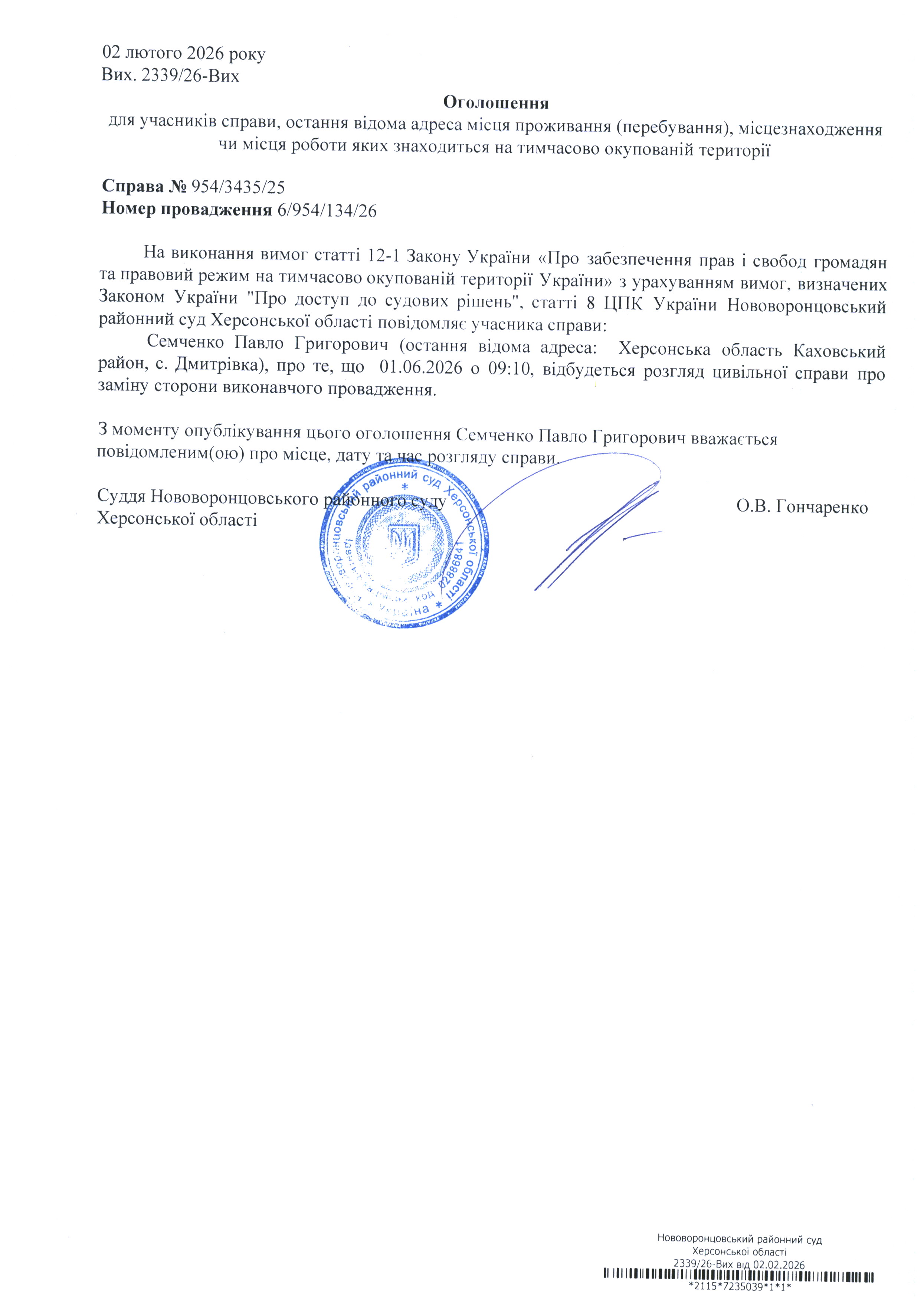 До суду викликається Семченко Павло Григорович на 9 год. 10 хв. 1 червня 2026 року