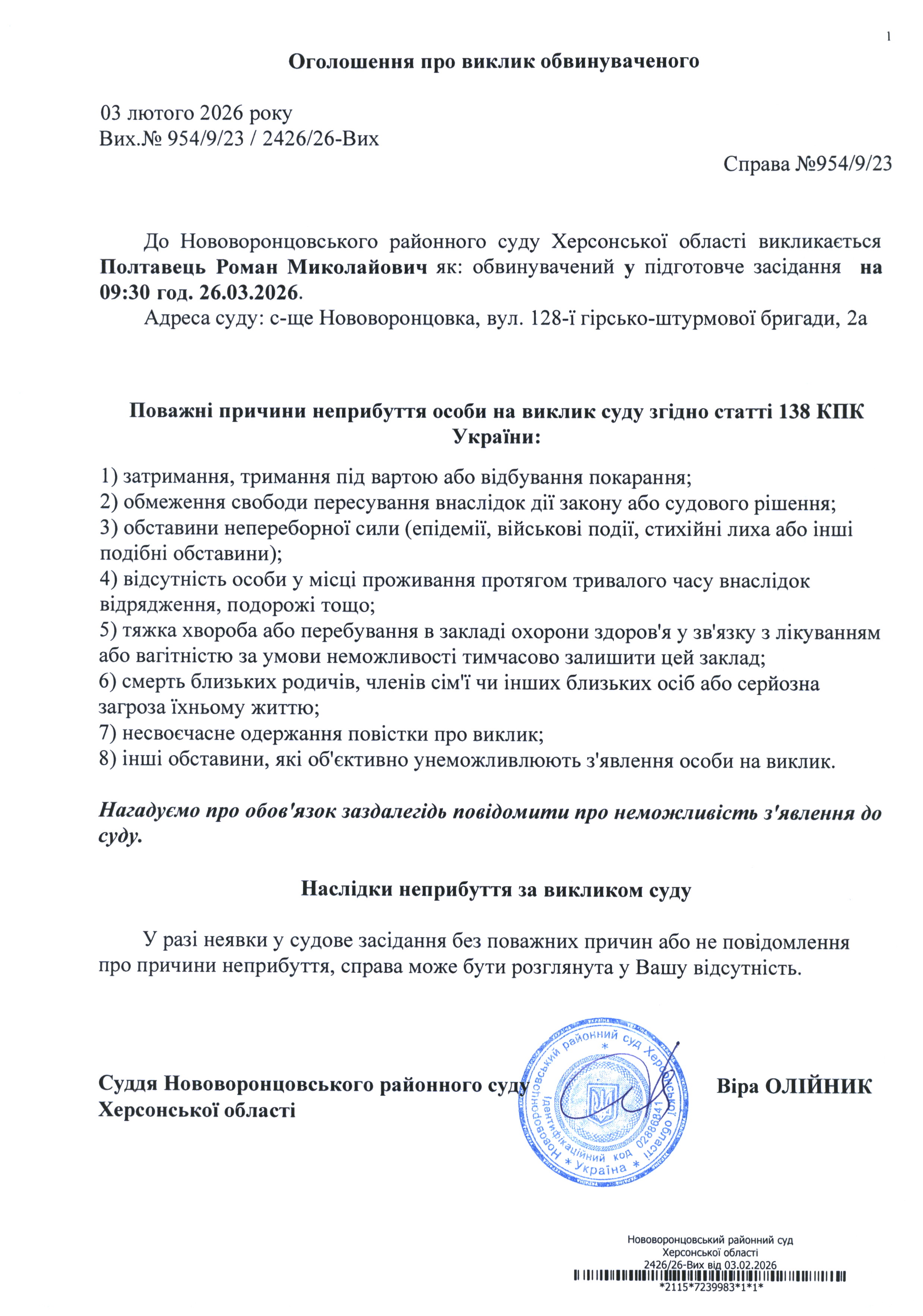 До суду викликається Полтавець Роман Миколайович на 9 год. 30 хв. 26 березня 2026 року