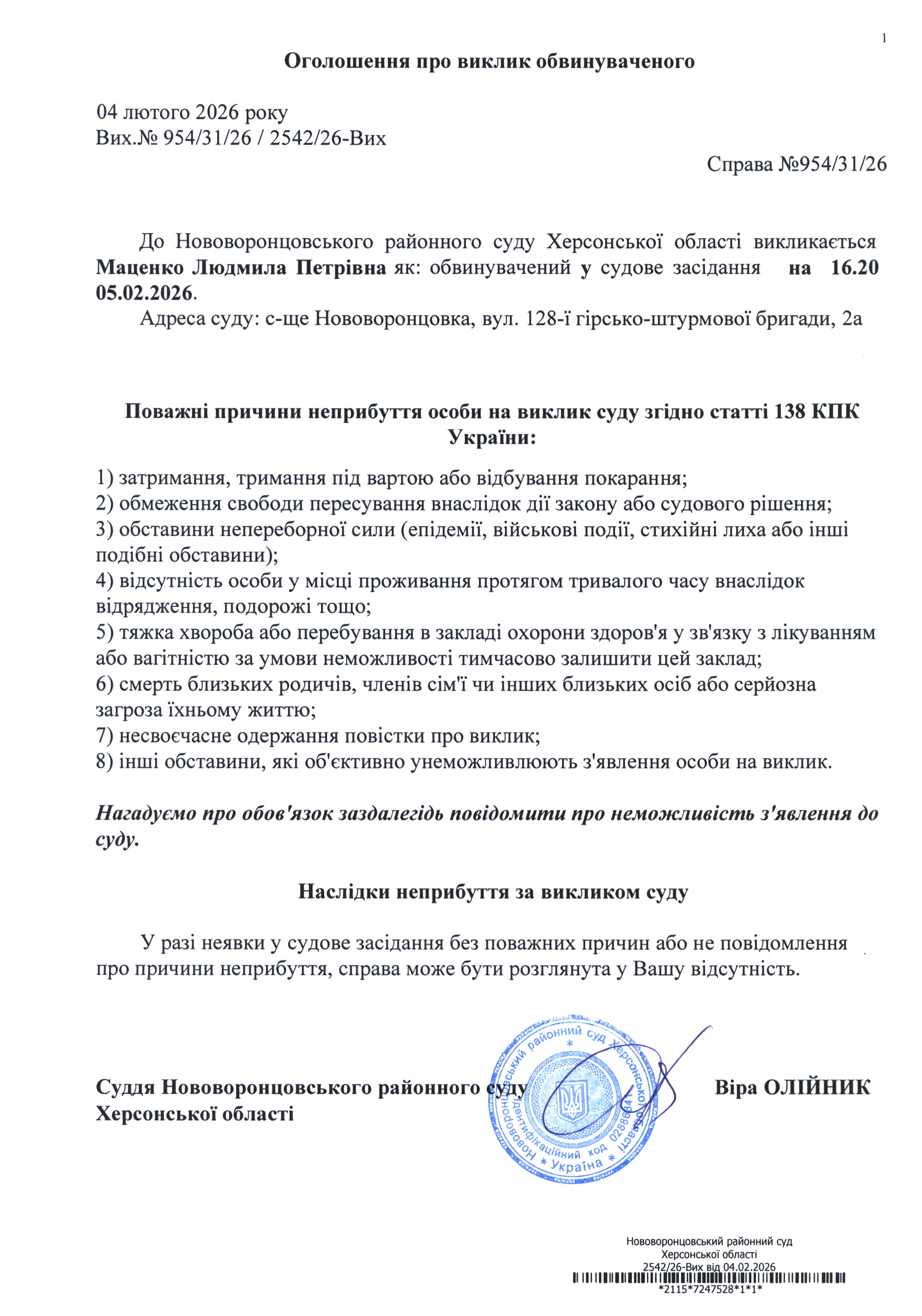 До суду викликається Маценко Людмила Петрівна на 16 год. 20 хв. 5 лютого 2026 року