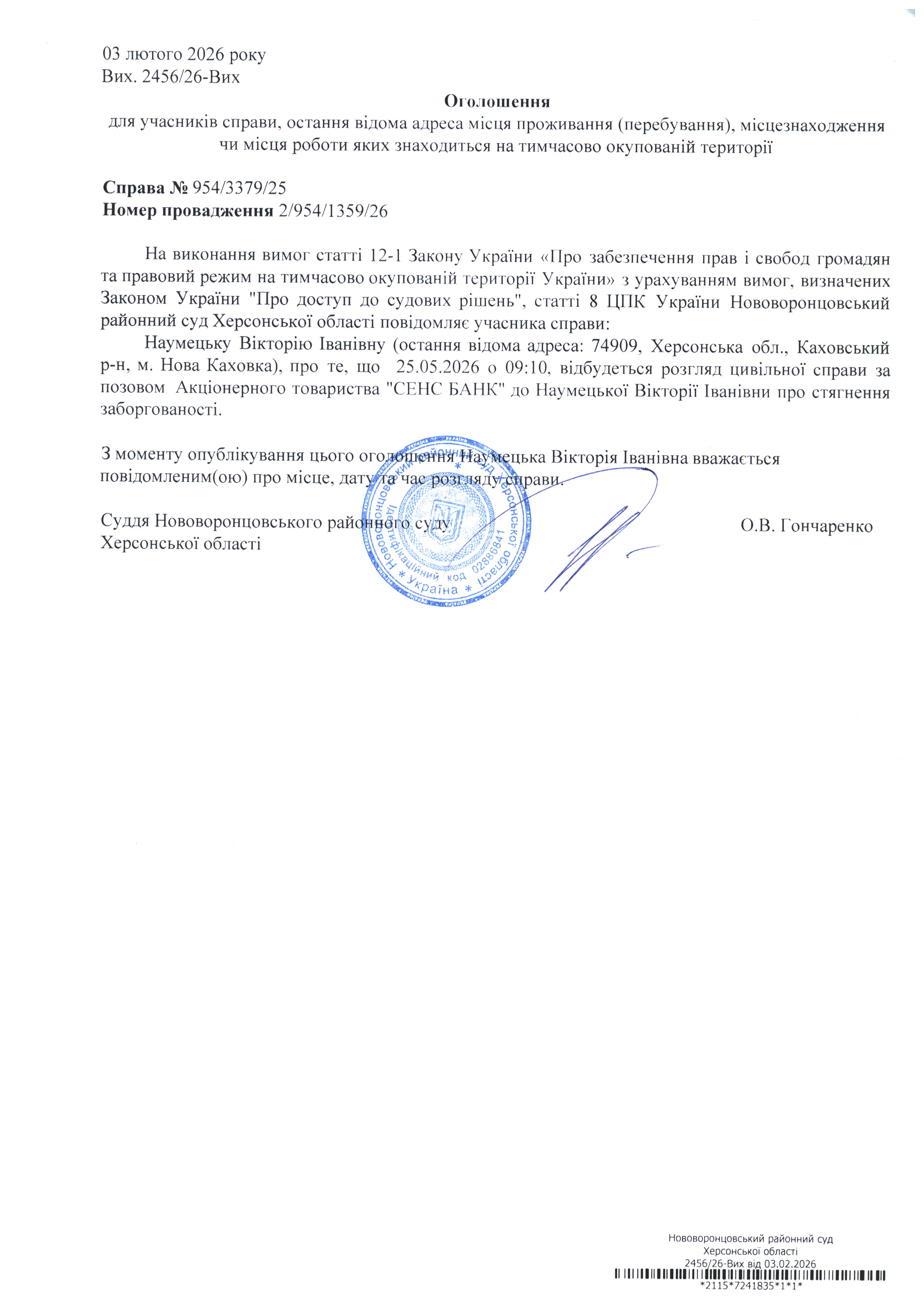 До суду викликається Наумецька Вікторія Іванівна на 9 год. 10 хв. 25 травня 2026 року