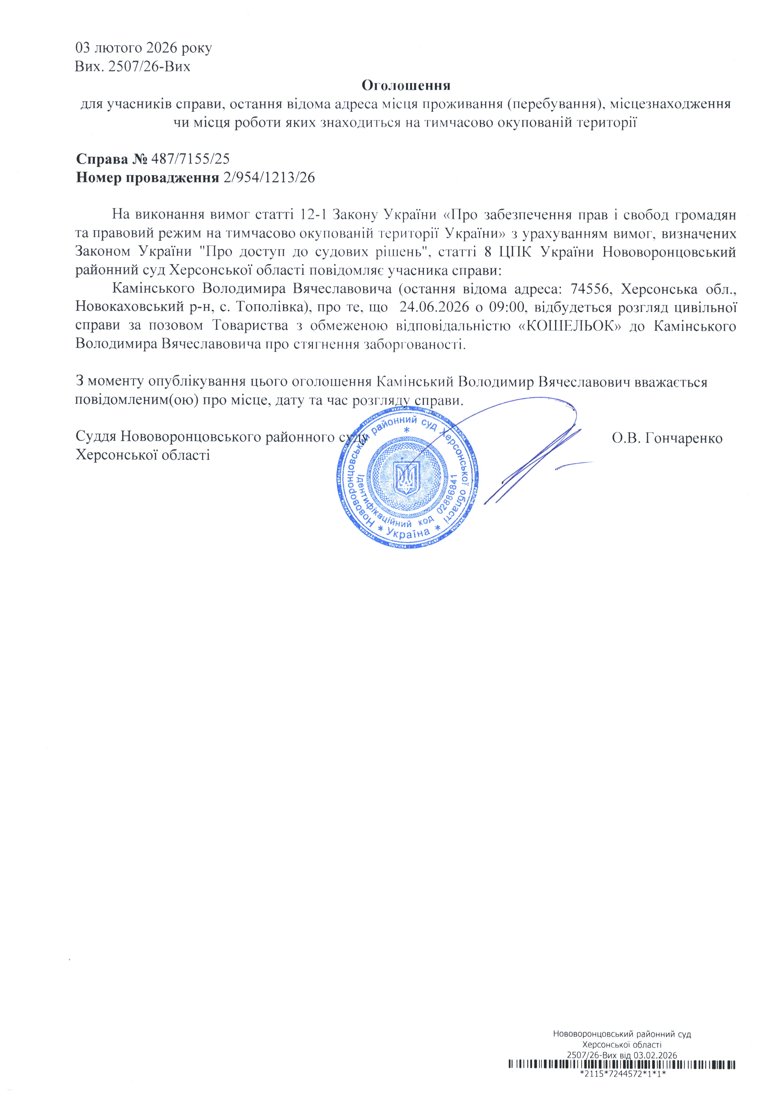 До суду викликається Камінський Володимир Вячеславович на 9 год. 00 хв. 24 червня 2026 року