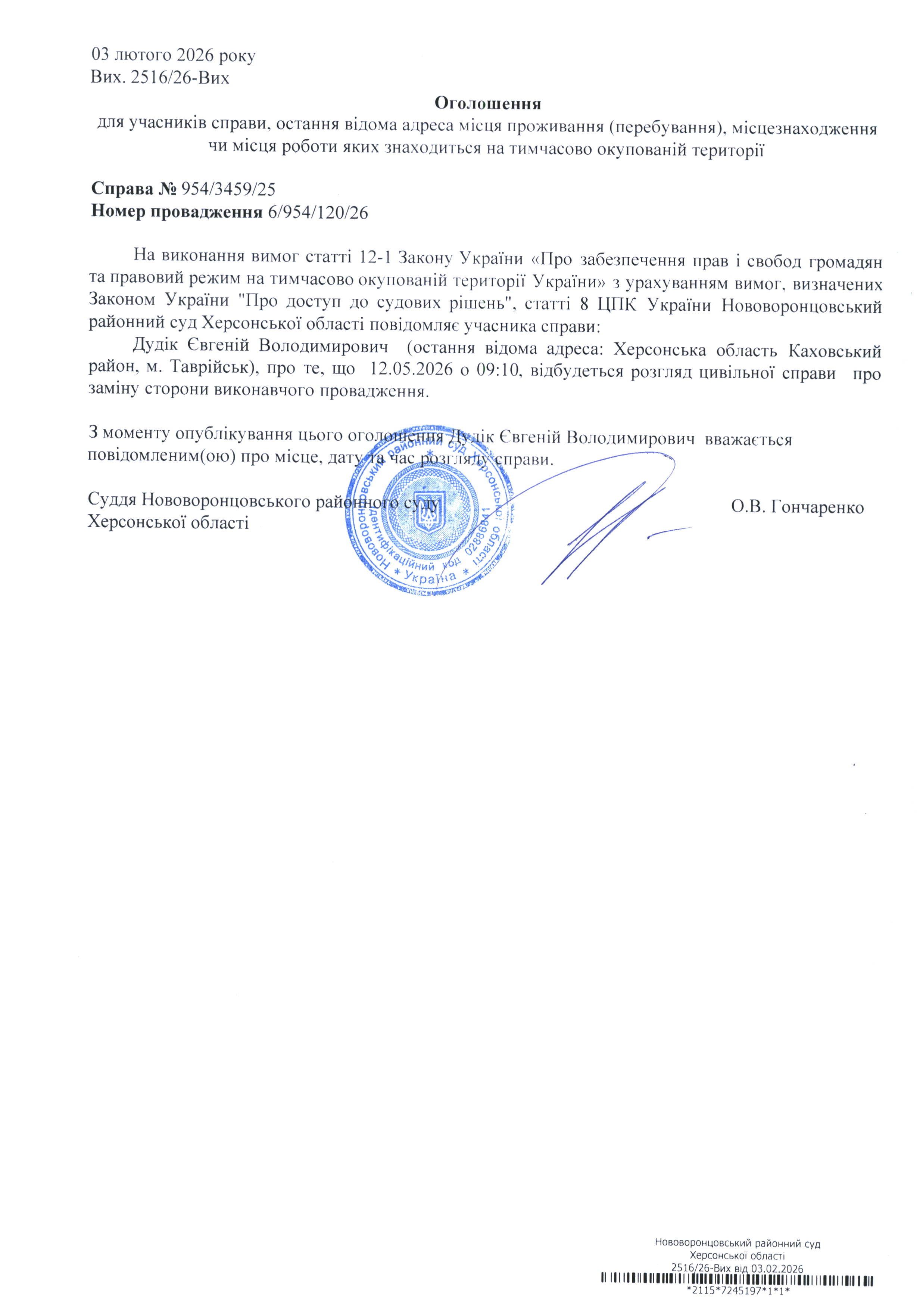 До суду викликається Дудік Євгеній Володимирович на 9 год. 10 хв. 12 травня 2026 року