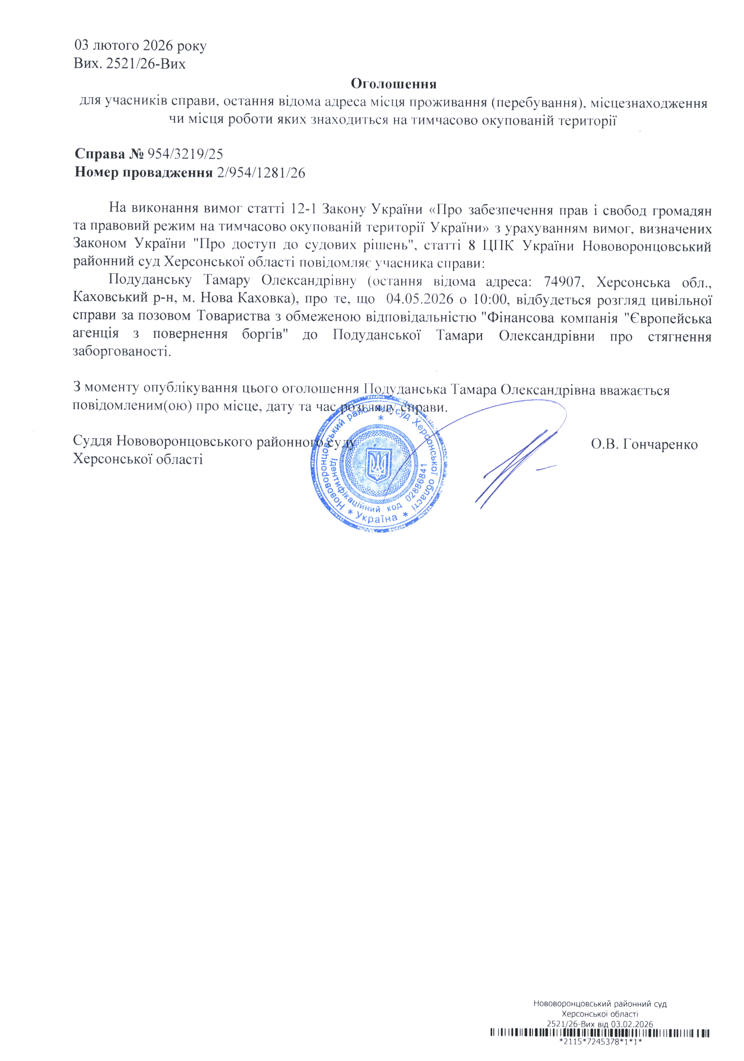 До суду викликається Подуданська Тамара Олександрівна на 10 год. 00 хв. 4 травня 2026 року