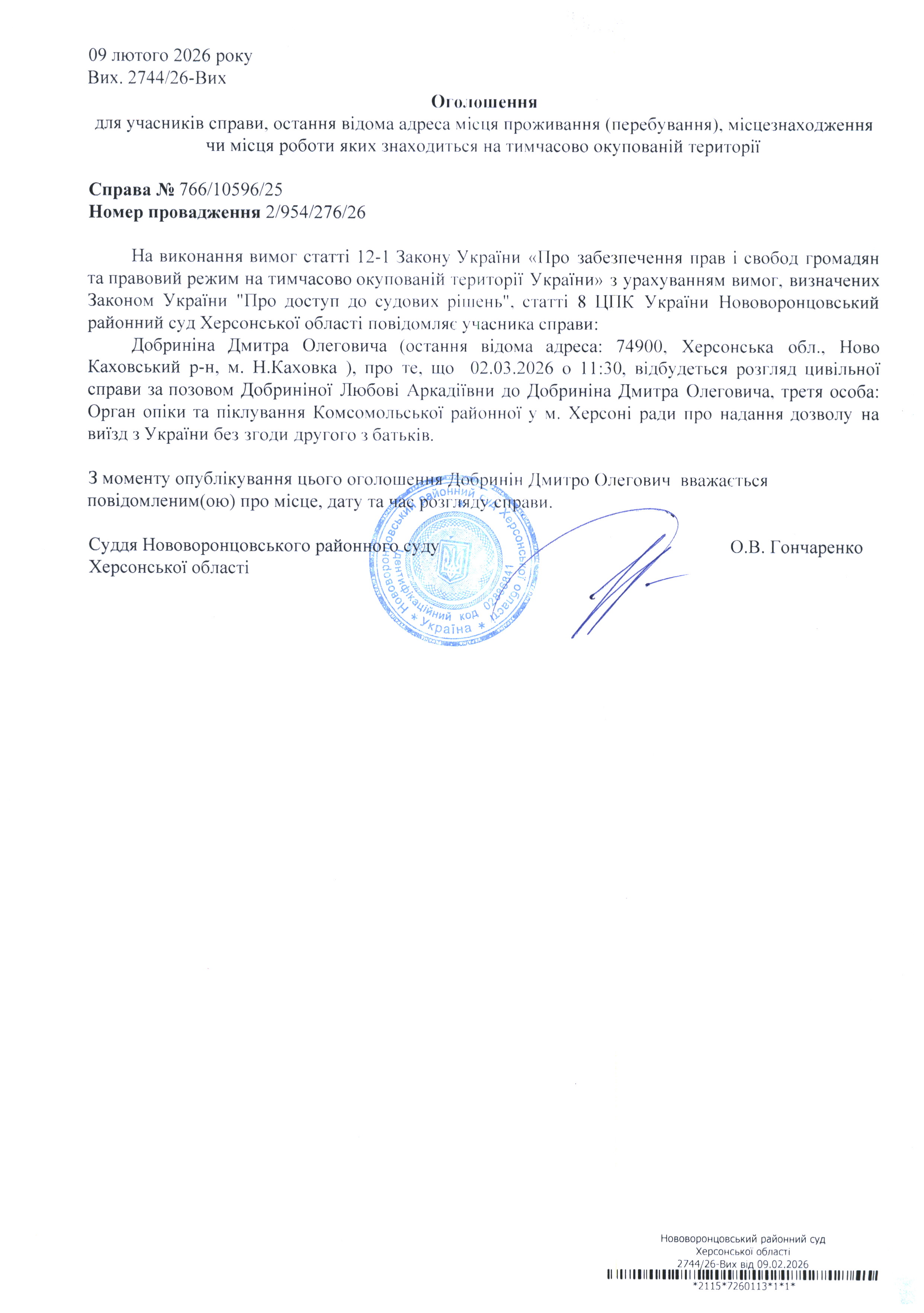 До суду викликається Добринін Дмитро Олегович на 11 год. 30 хв. 2 березня 2026 року