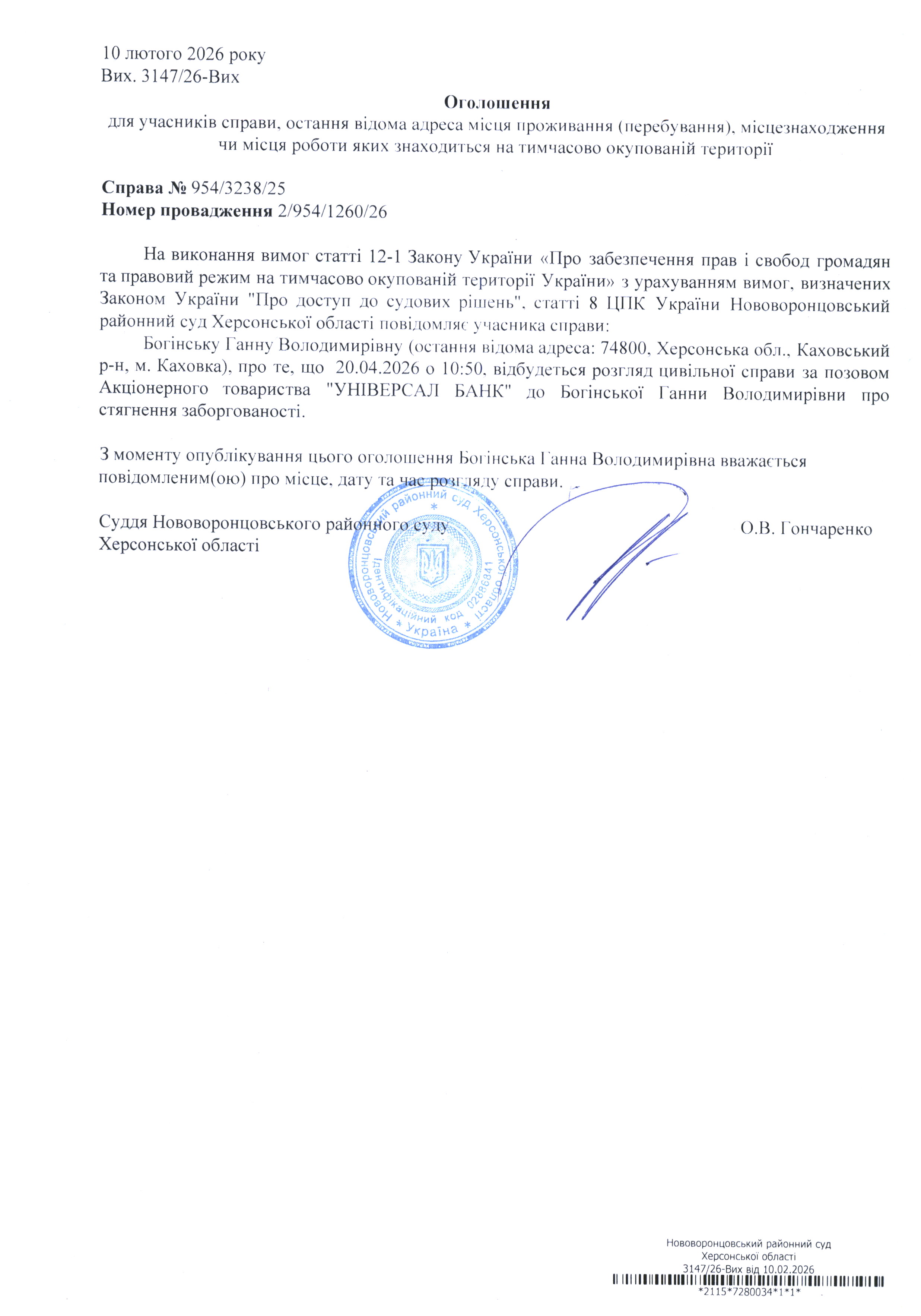 До суду викликається Богінська Ганна Володимирівна на 10 год. 50 хв. 20 квітня 2026 року