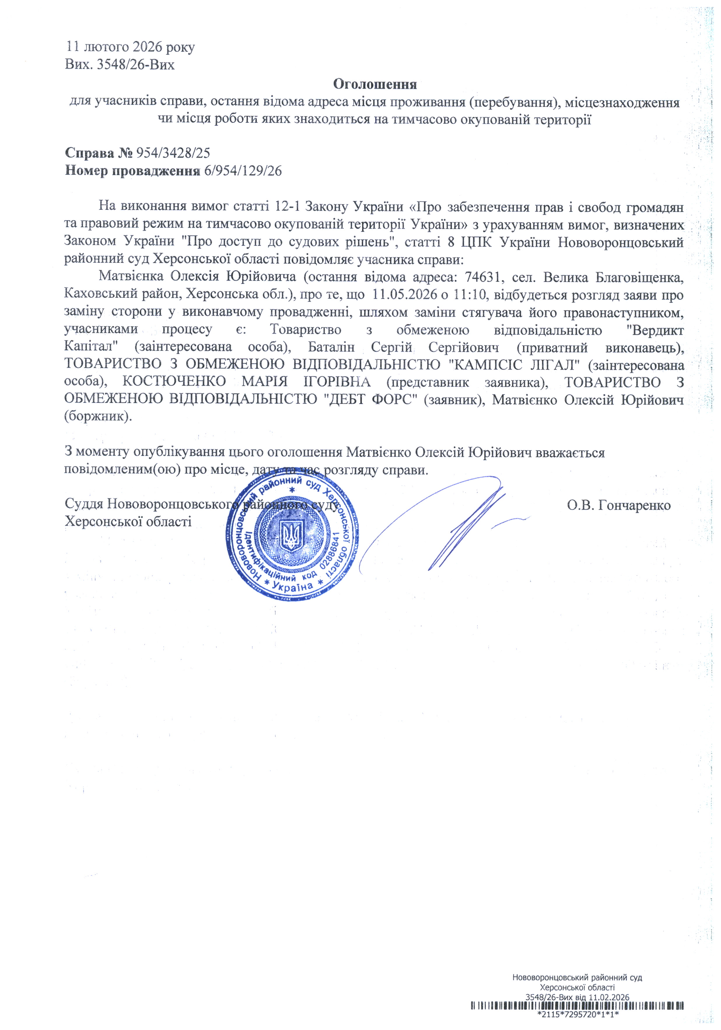 До суду викликається Матвієнко Олексій Юрійович на 11 год. 10 хв. 11 травня 2026 року