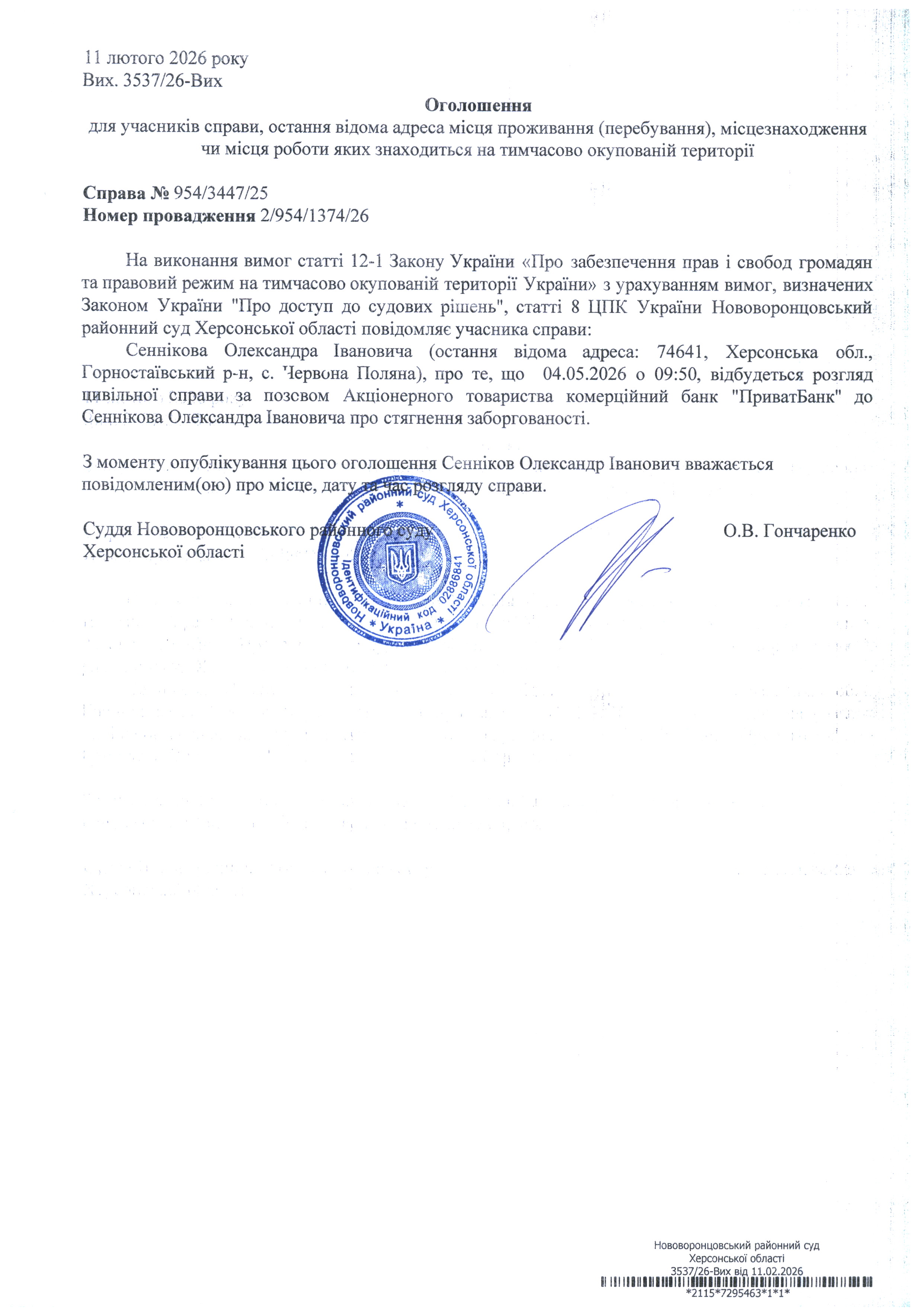 До суду викликається Сенніков Олександр Іванович на 9 год. 50 хв. 4 травня 2026 року