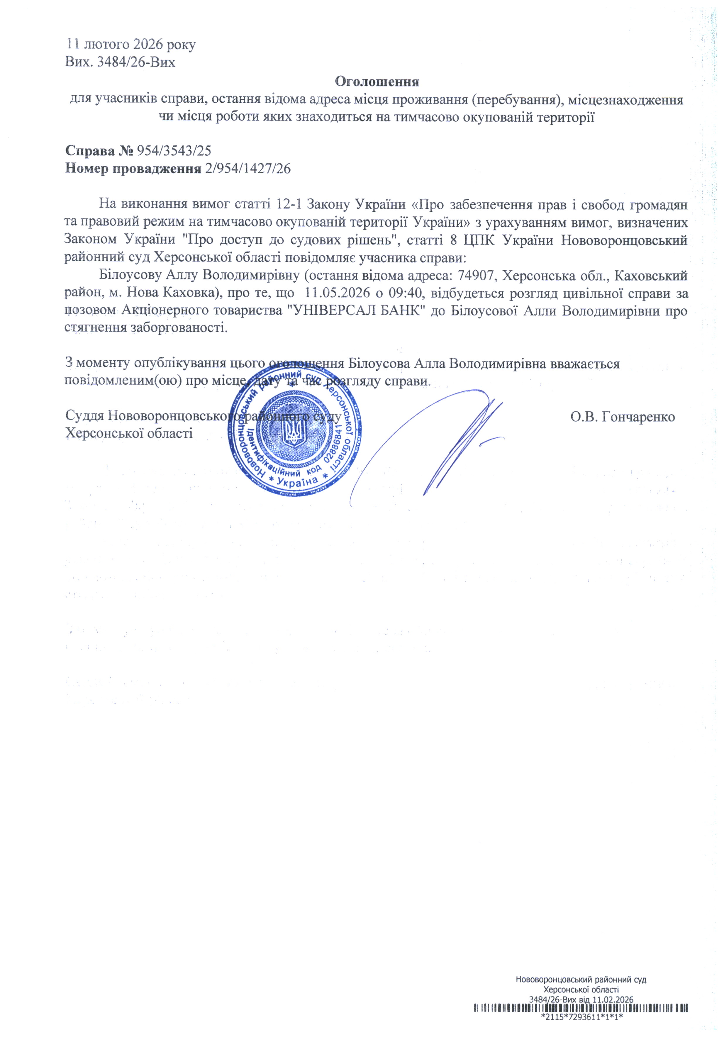 До суду викликається Білоусова Алла Володимирівна на 9 год. 40 хв. 11 травня 2026 року