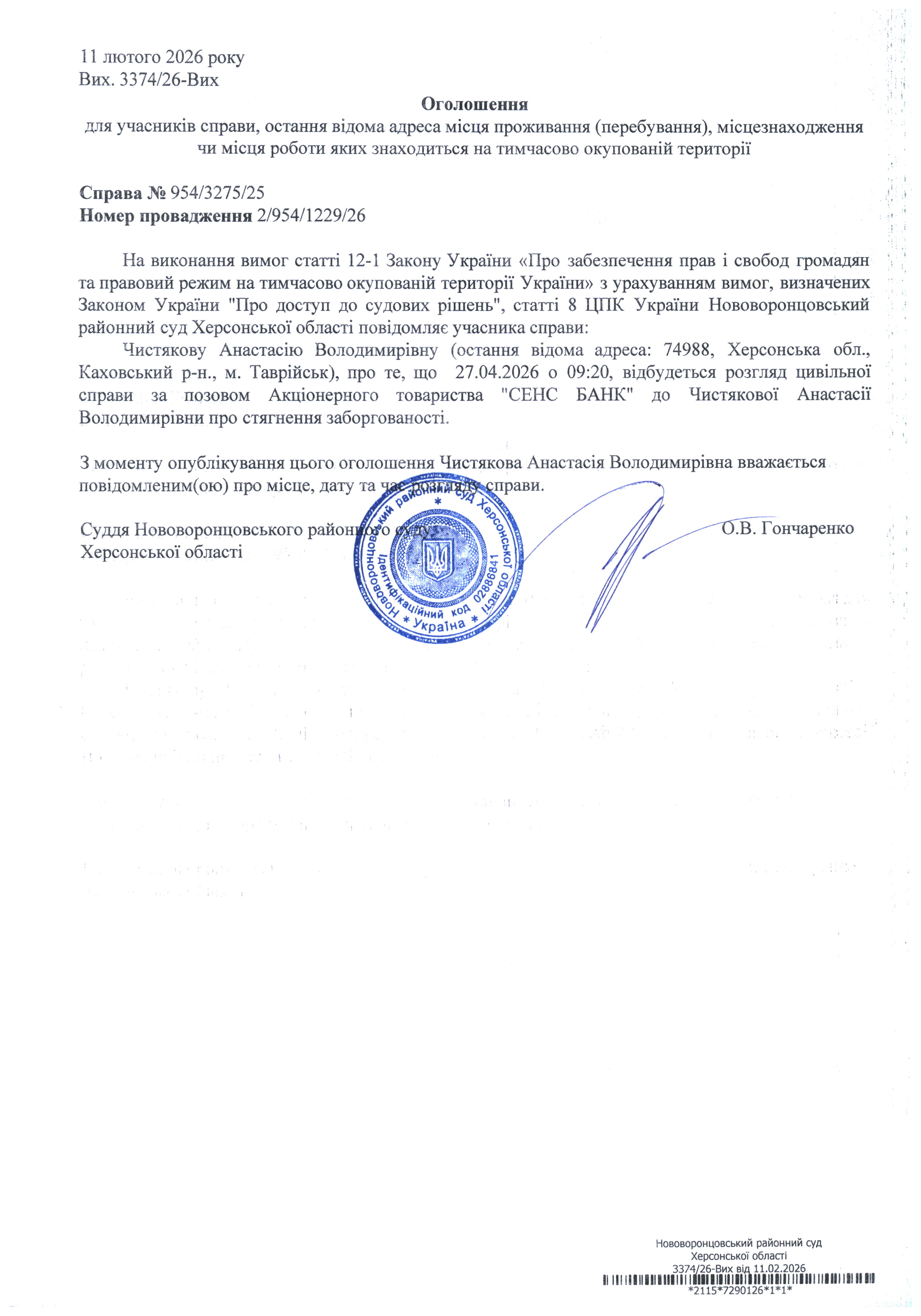 До суду викликається Чистякова Анастасія Володимирівна на 9 год. 20 хв. 27 квітня 2026 року