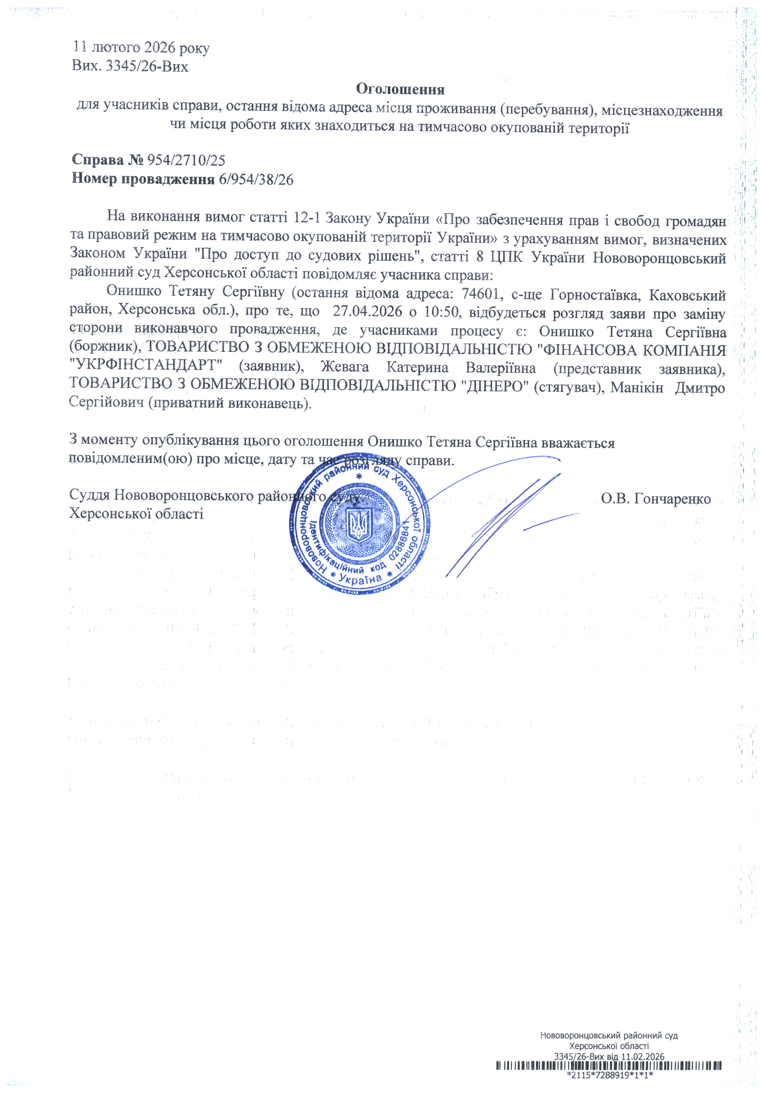 До суду викликається Онишко Тетяна Сергіївна на 10 год. 50 хв. 27 квітня 2026 року