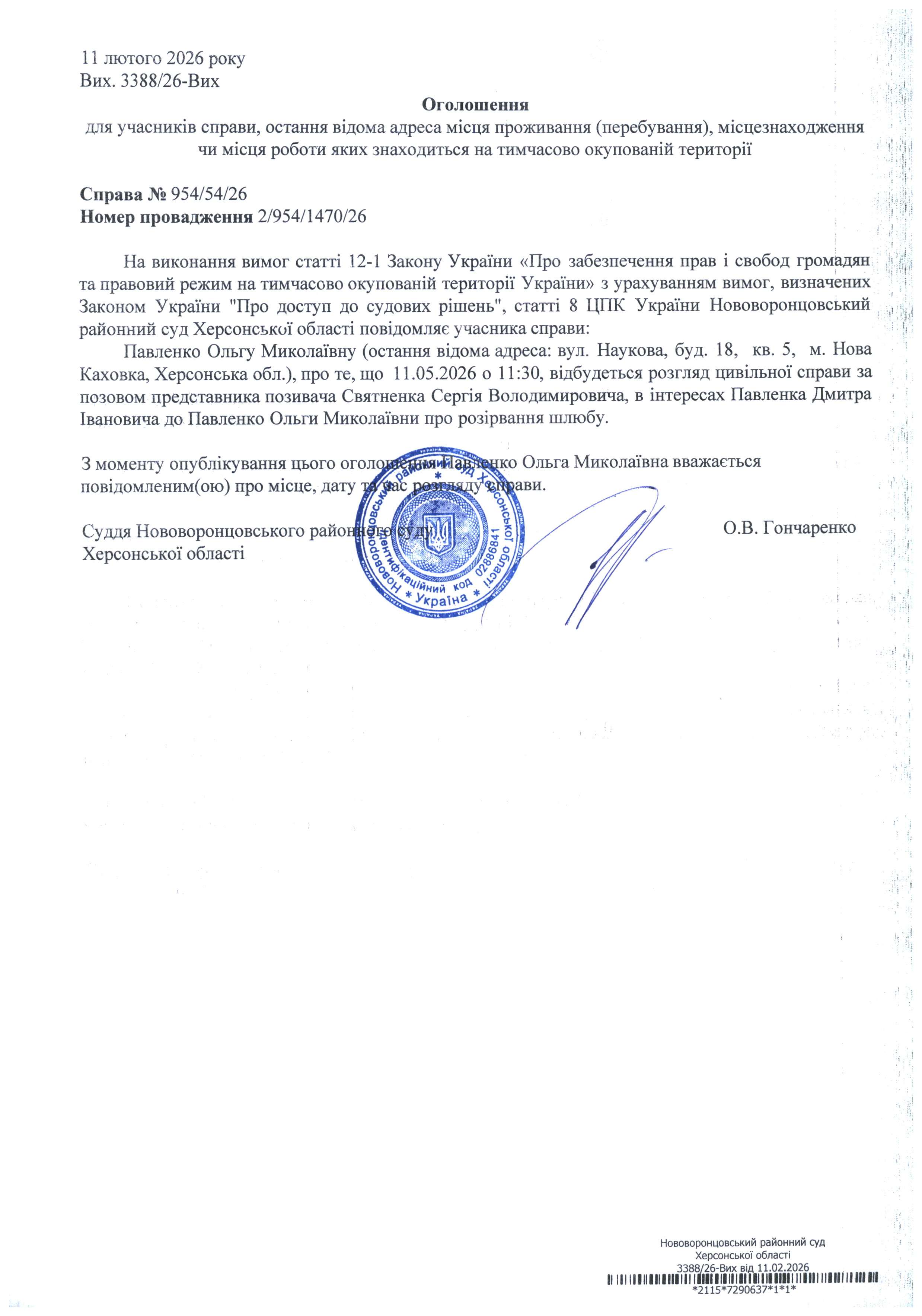 До суду викликається Павленко Ольга Миколаївна на 11 год. 30 хв. 11 травня 2026 року