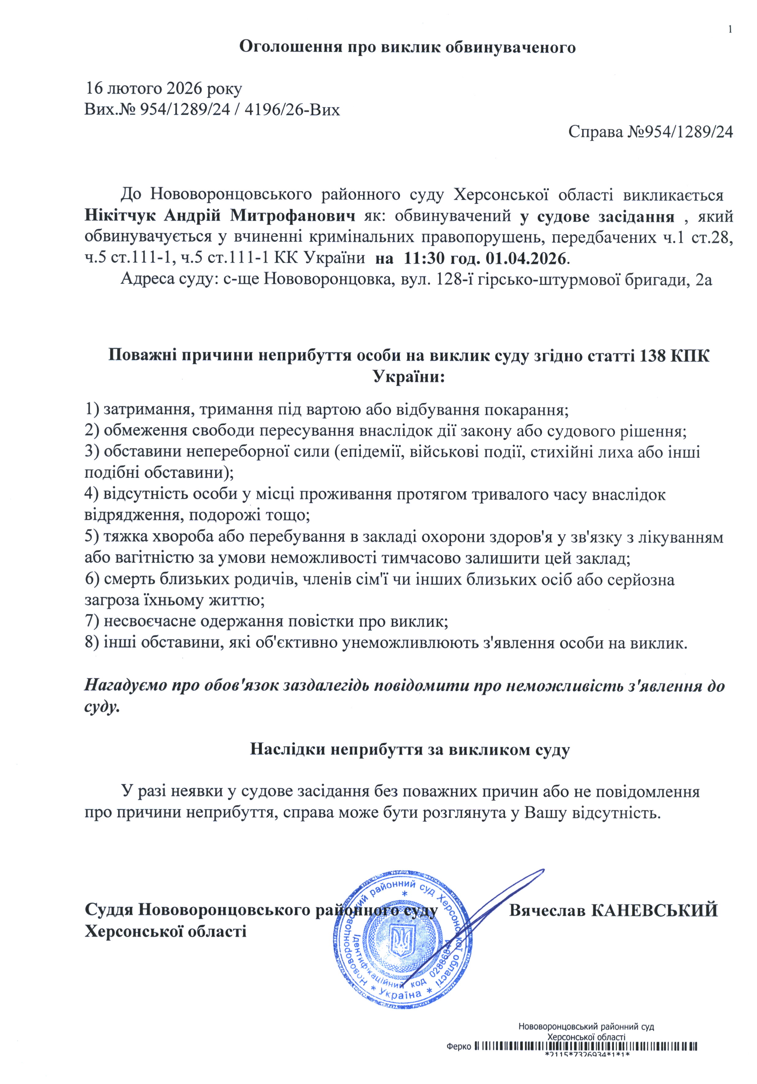 До суду викликається Нікітчук Андрій Митрофанович на 11 год. 30 хв. 1 квітня 2026 року