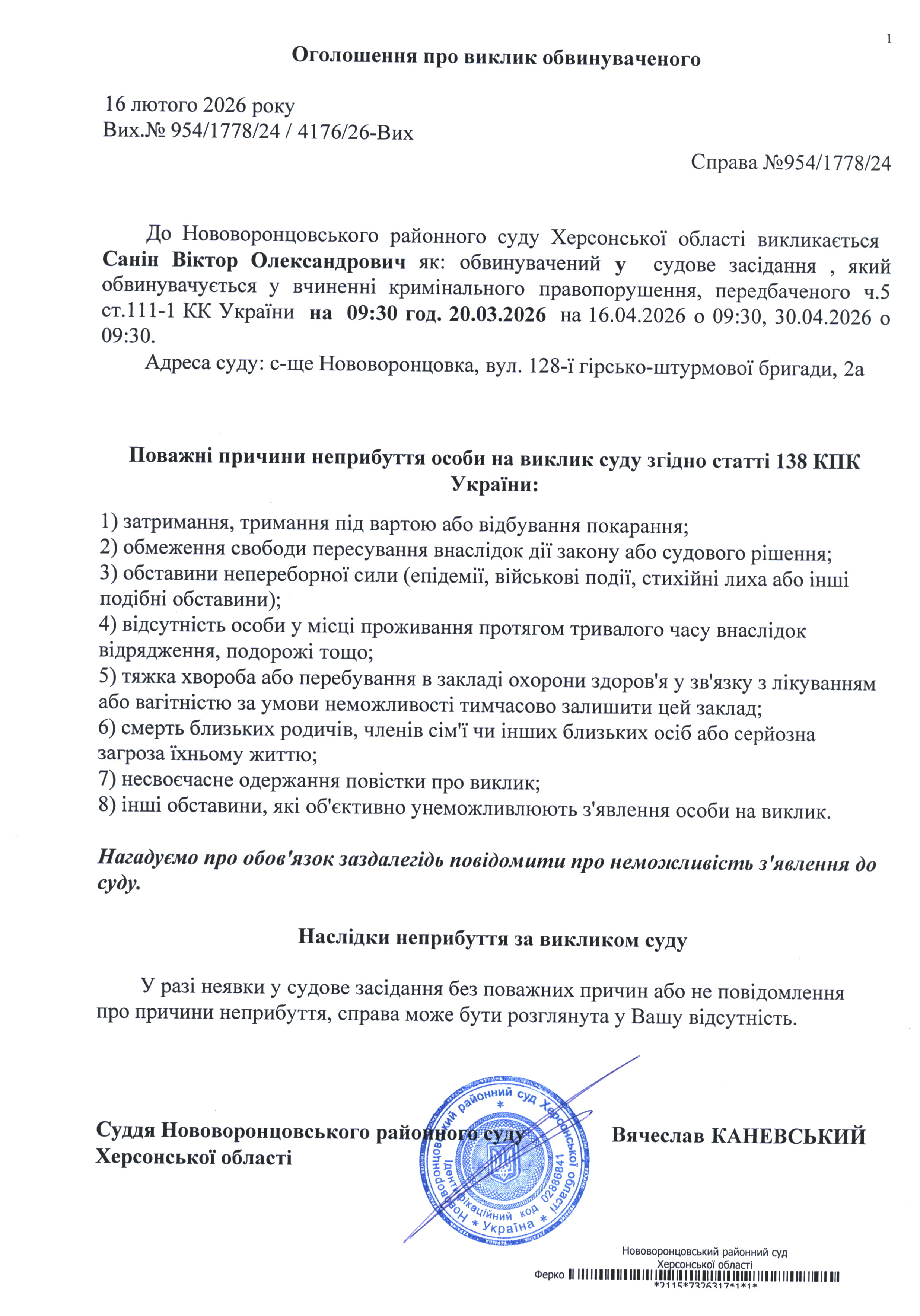 До суду викликається Санін Віктор Олександрович на 9 год. 30 хв. 20 березня; на 9 год. 30 хв. 16 квітня; на 9 год. 30 хв. 30 квітня 2026 року