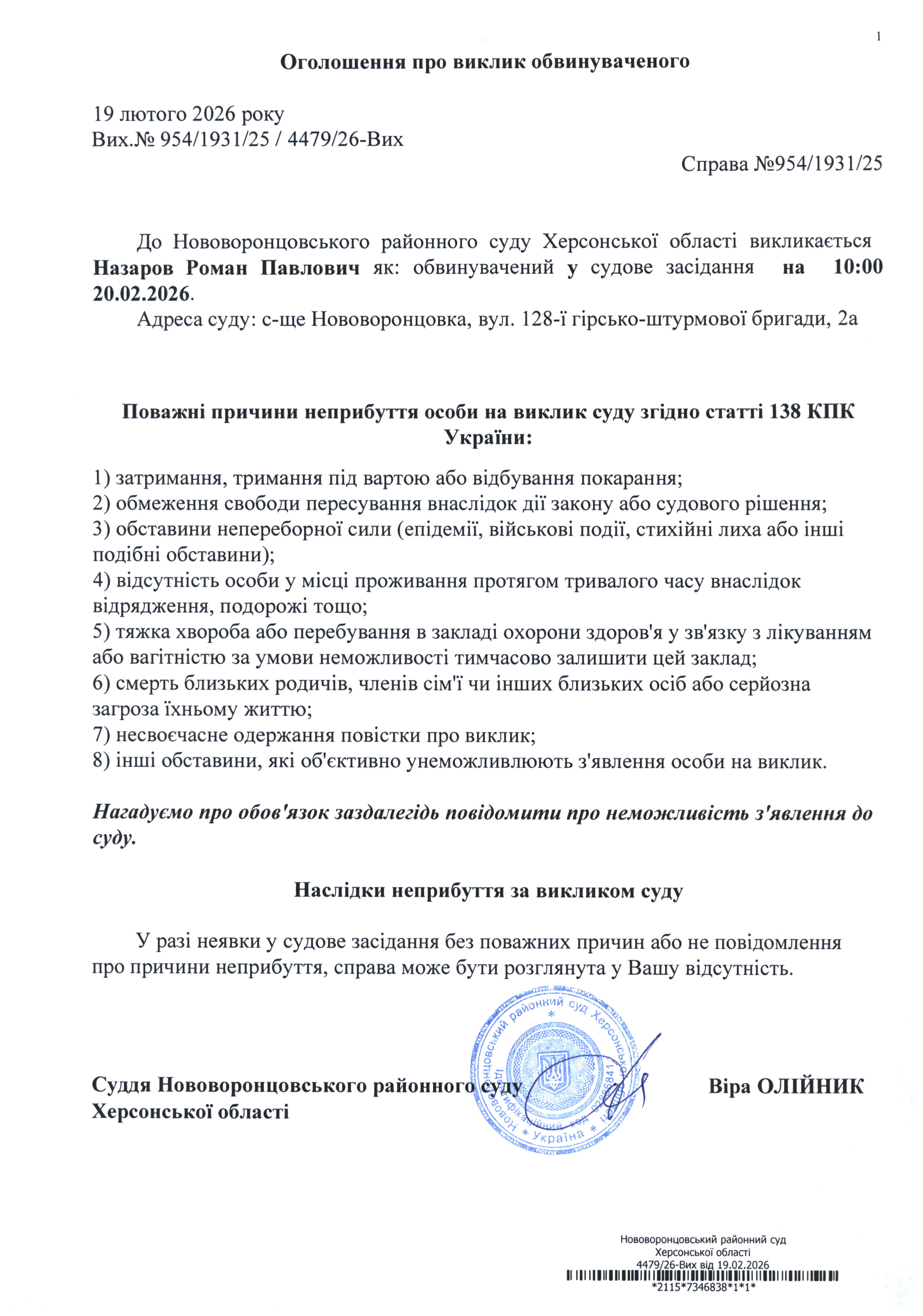 До суду викликається Назаров Роман Павлович на 10 год. 00 хв. 20 лютого 2026 року