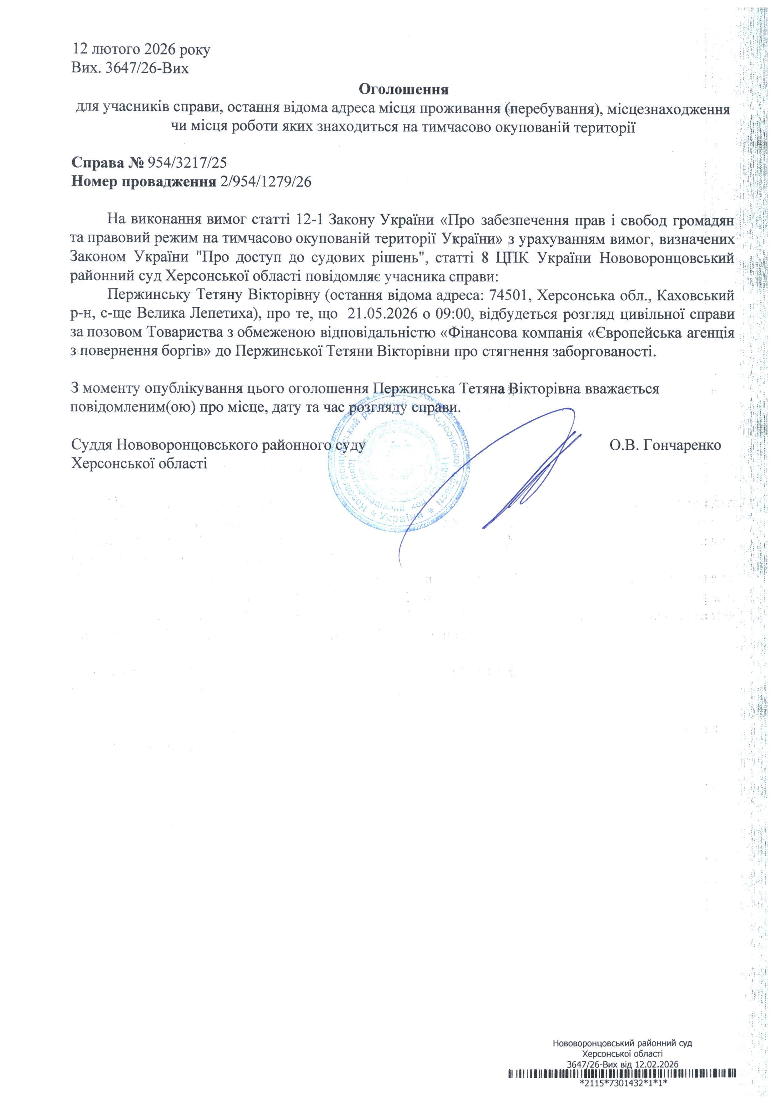 До суду викликається Пержинська Тетяна Вікторівна на 9 год. 00 хв. 21 травня 2026 року