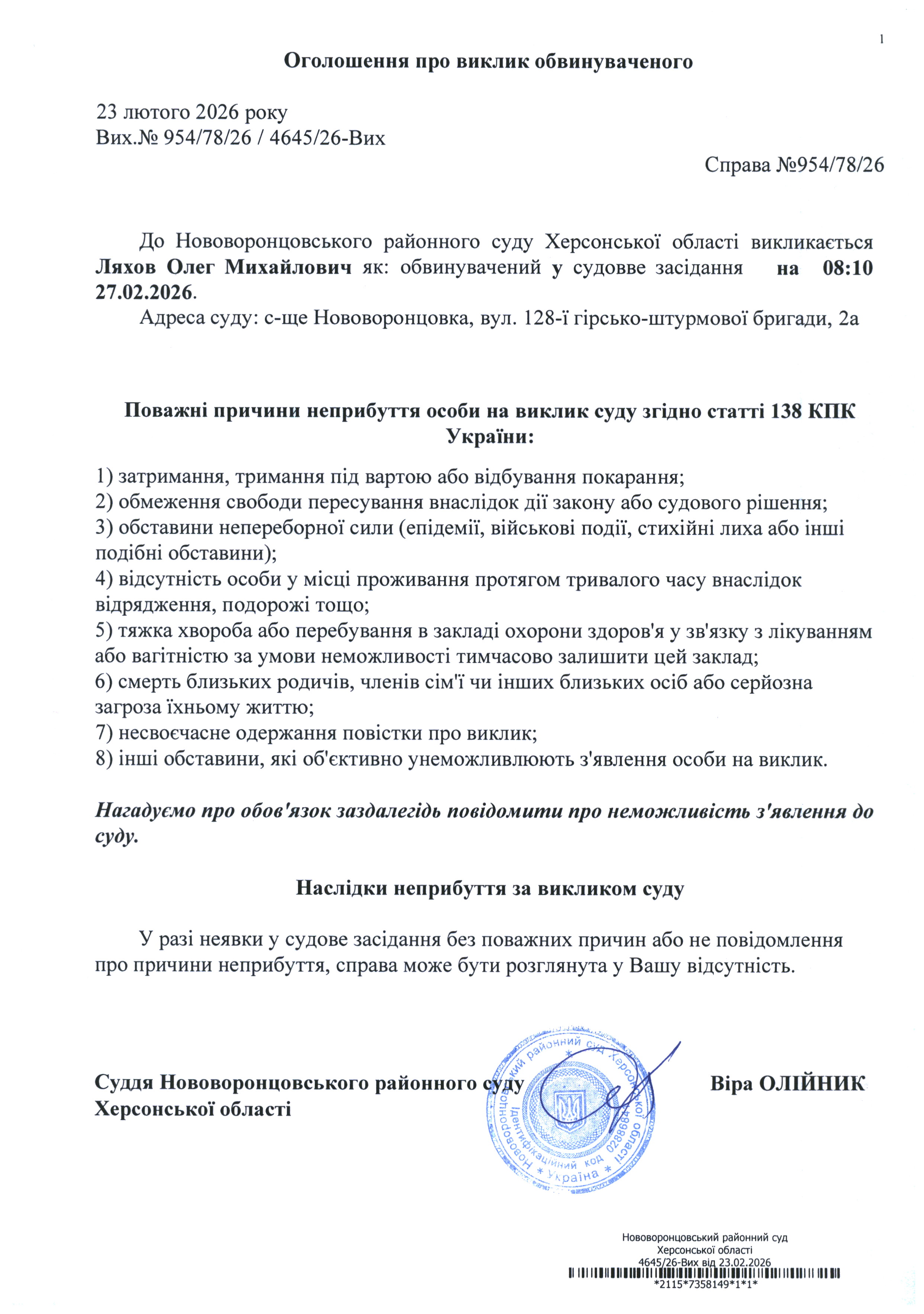 До суду викликається Ляхов Олег Михайлович на 8 год. 10 хв. 27 лютого 2026 року