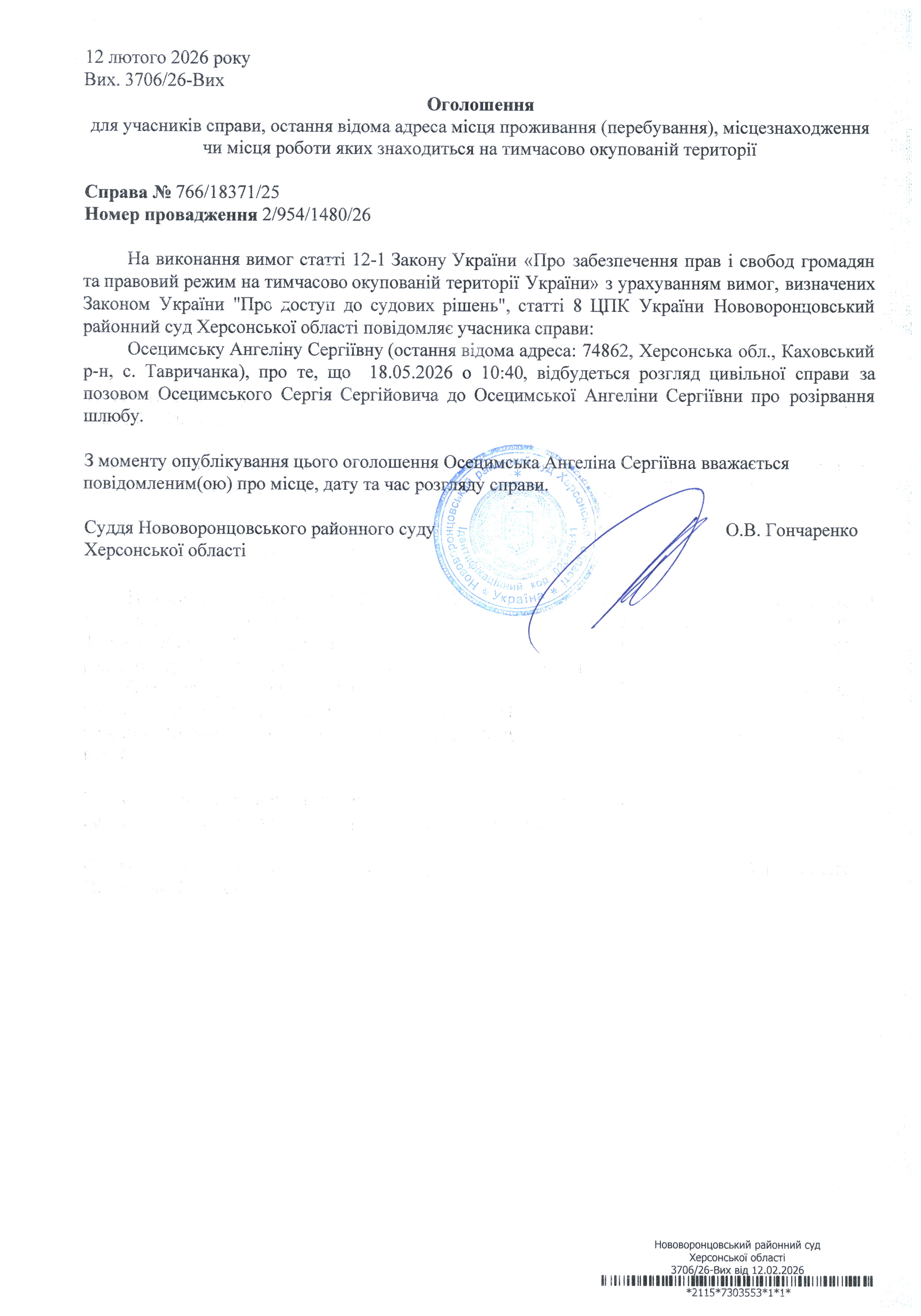 До суду викликається Осецимська Ангеліна Сергіївна на 10 год. 40 хв. 18 травня 2026 року