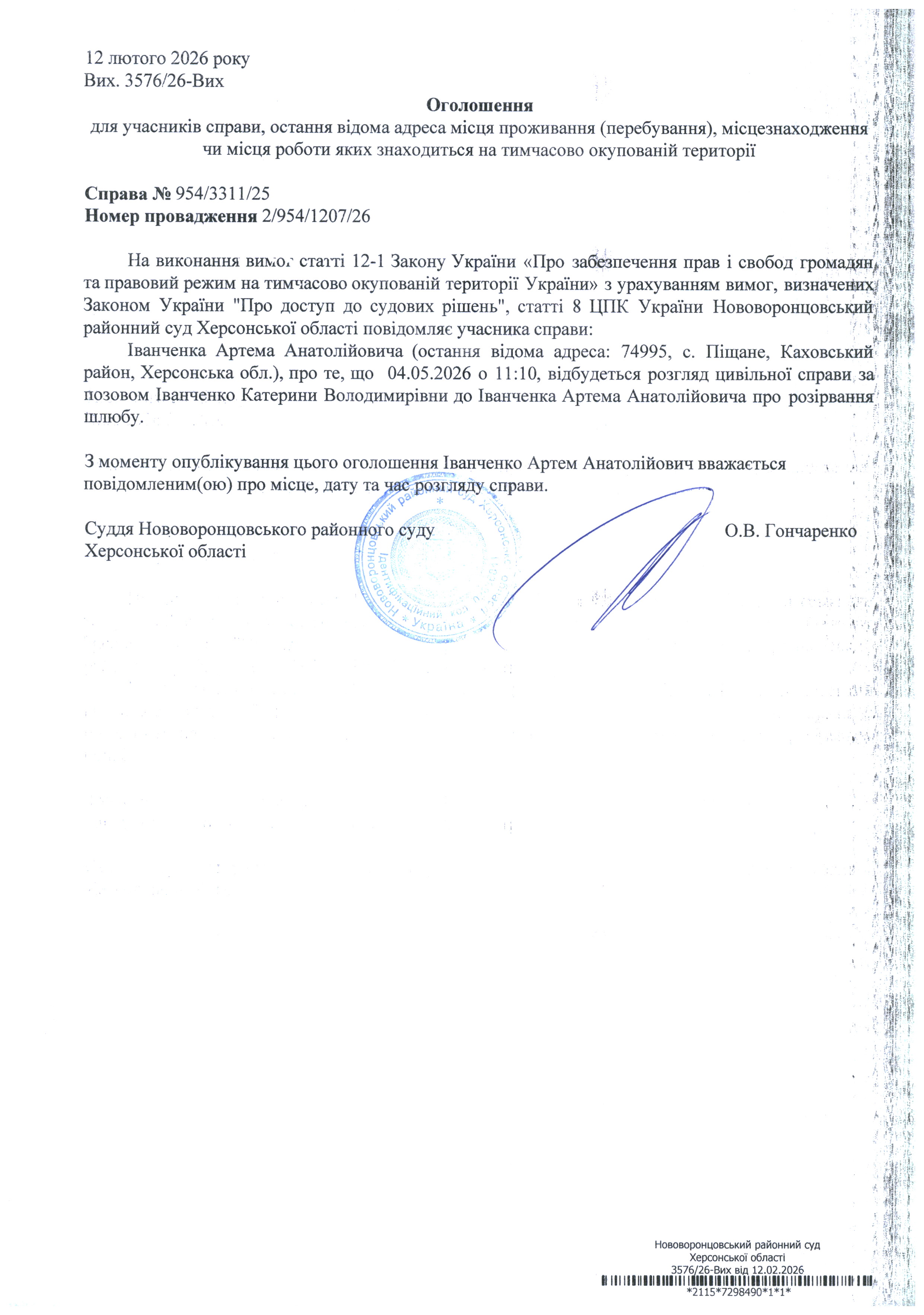 До суду викликається Іванченко Артем Анатолійович на 11 год. 10 хв. 4 травня 2026 року