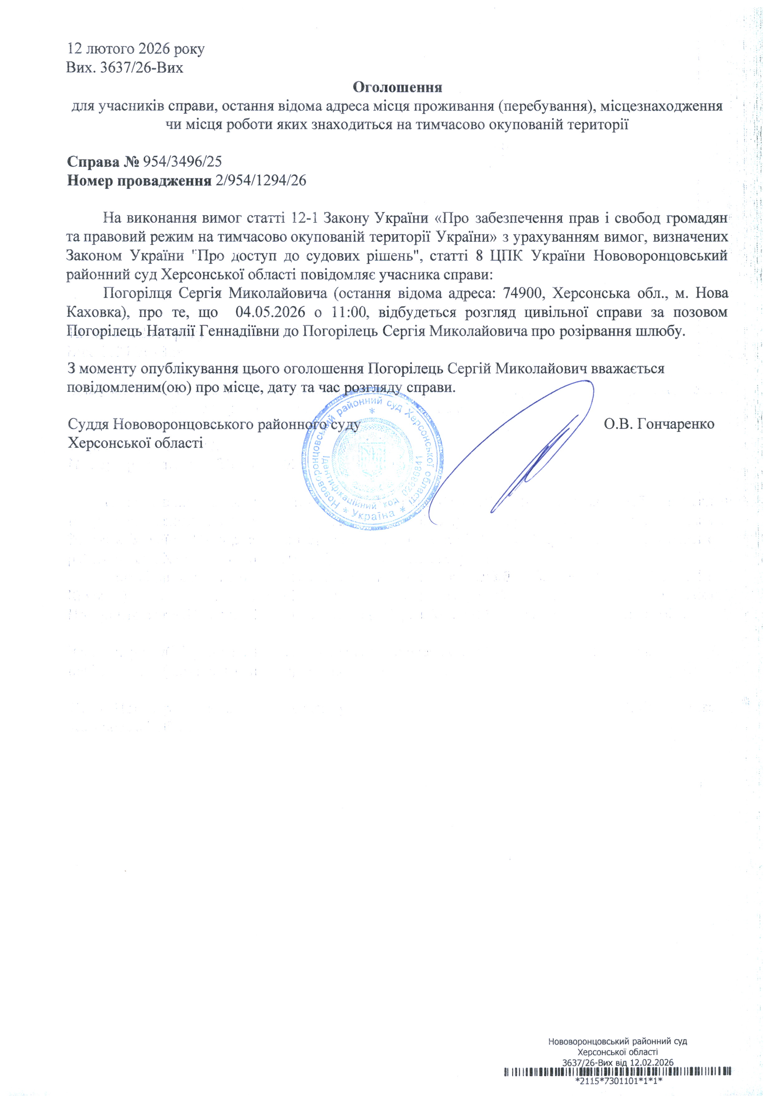 До суду викликається Погорілець Сергій Миколайович на 11 год. 00 хв. 4 травня 2026 року