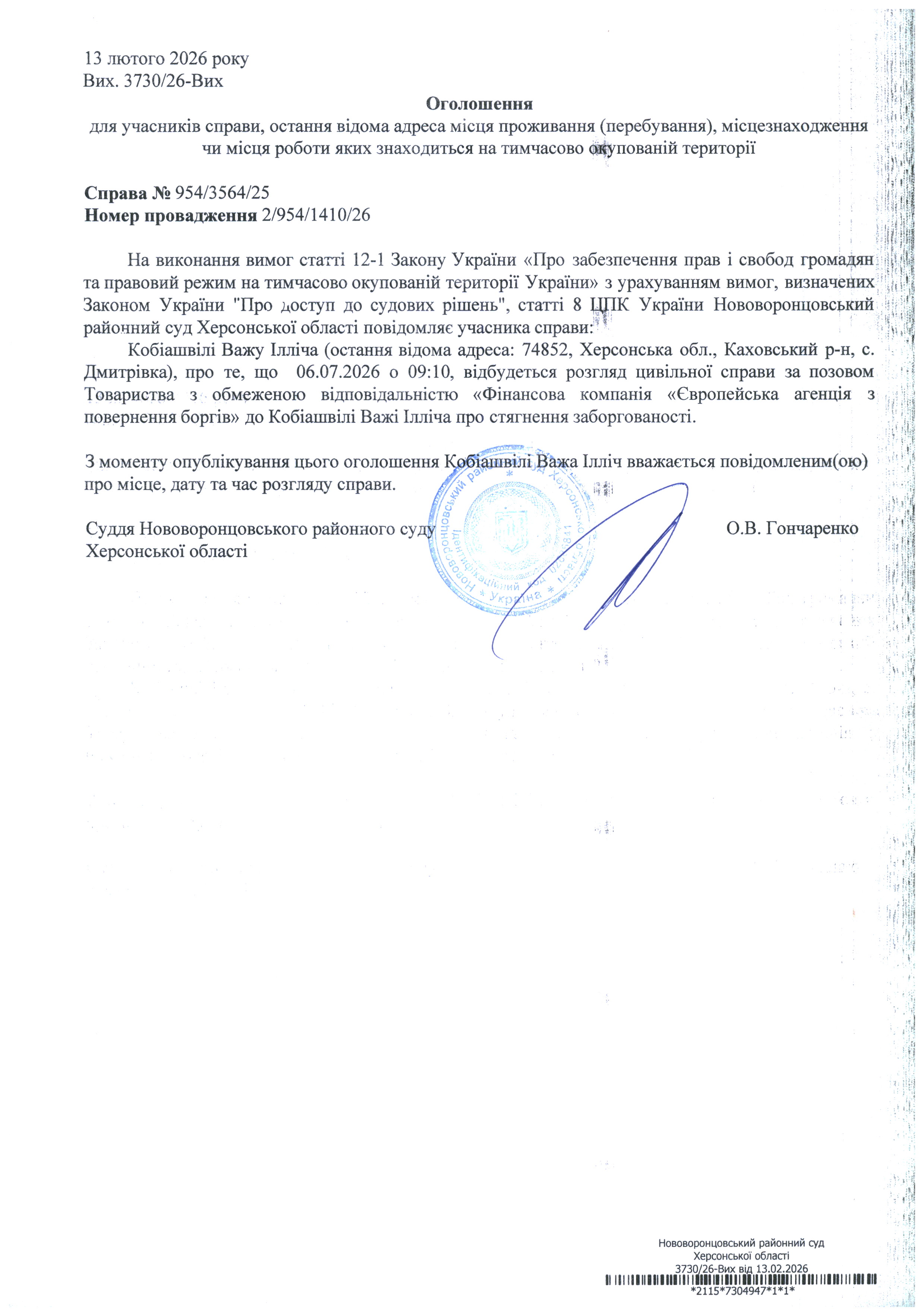 До суду викликається Кобіашвілі Важа Ілліч на 9 год. 10 хв. 6 липня 2026 року