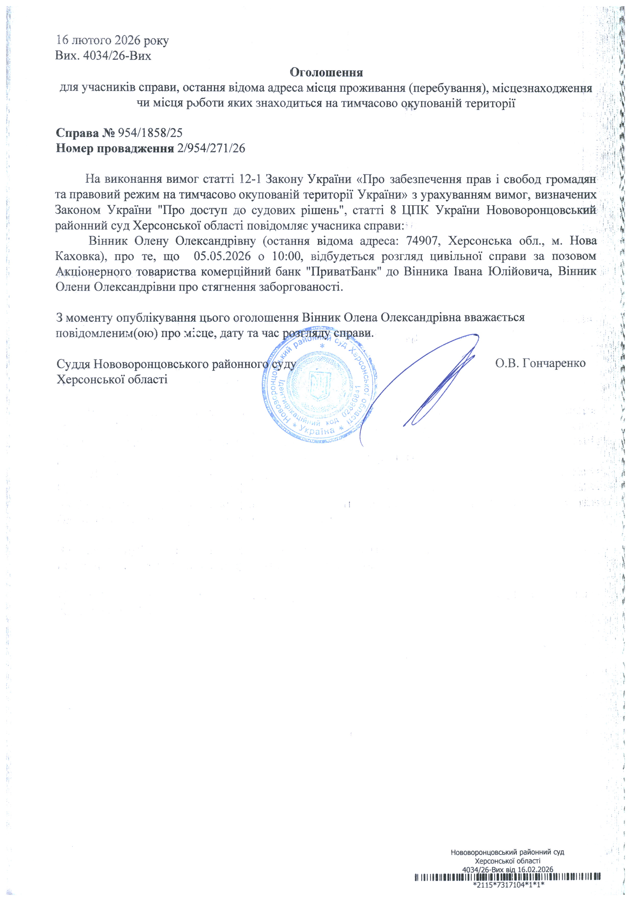 До суду викликається Вінник Олена Олександрівна на 10 год. 00 хв. 5 травня 2026 року