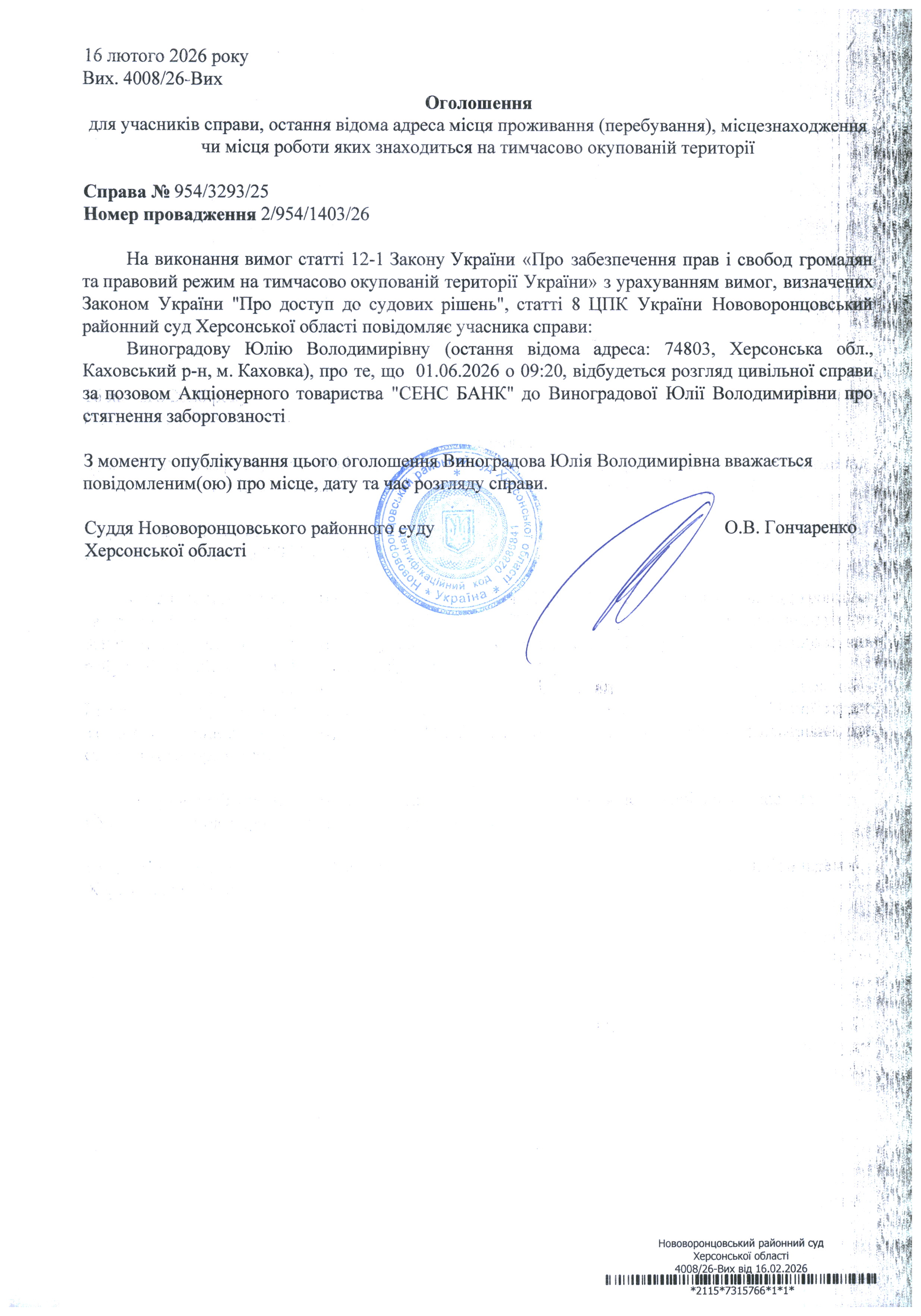 До суду викликається Виноградова Юлія Володимирівна на 9 год. 20 хв. 1 червня 2026 року