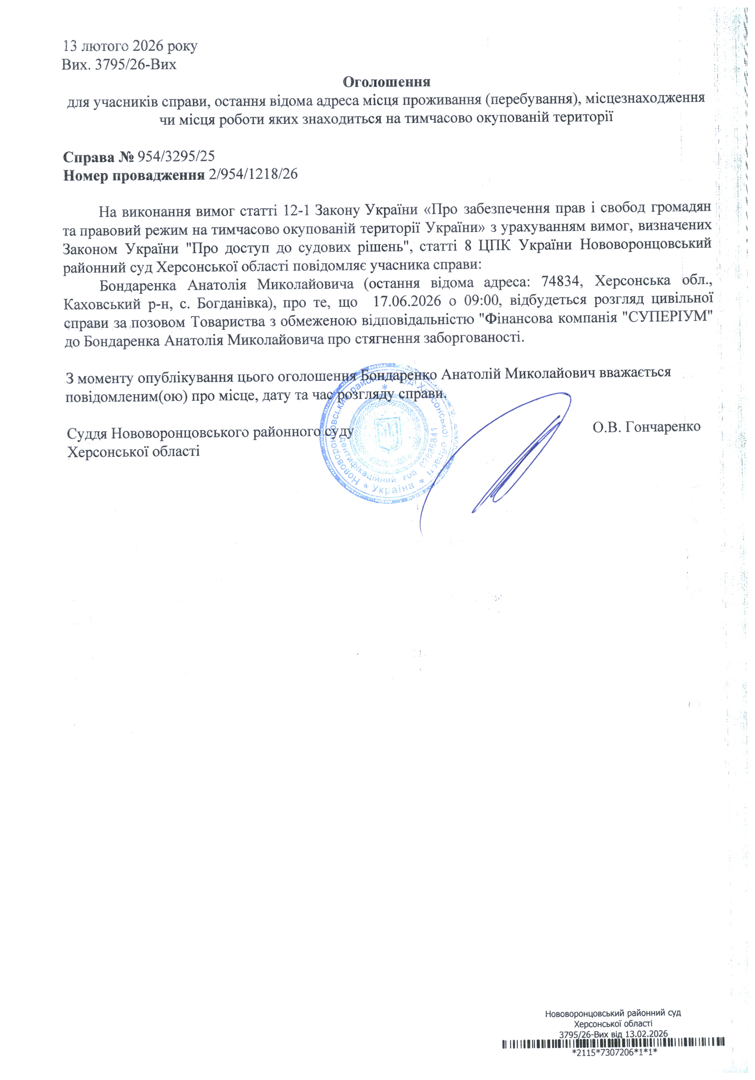 До суду викликається Бондаренко Анатолій Миколайович на 9 год. 00 хв. 17 червня 2026 року