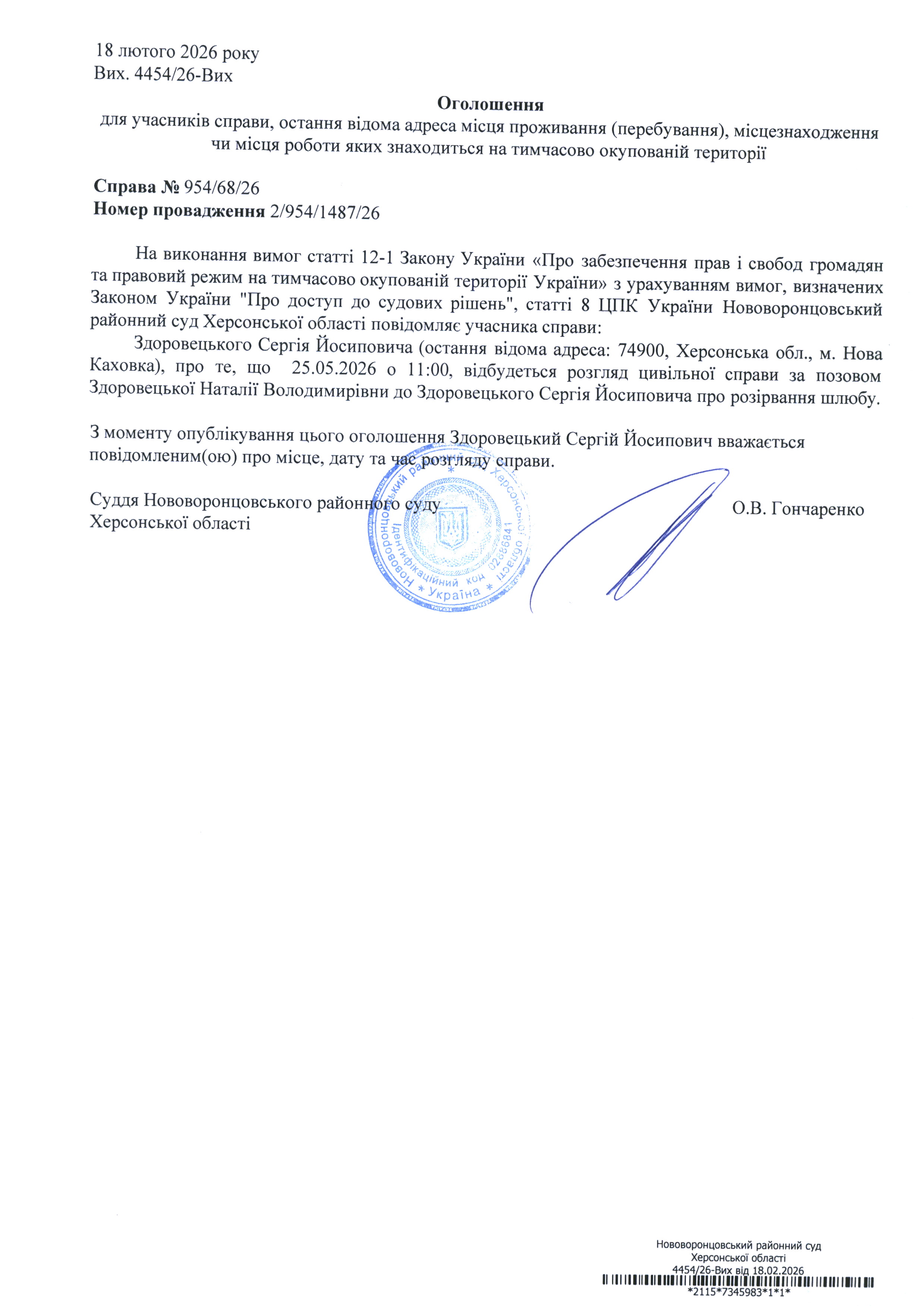 До суду викликається Здоровецький Сергій Йосипович на 11 год. 00 хв. 25 травня 2026 року