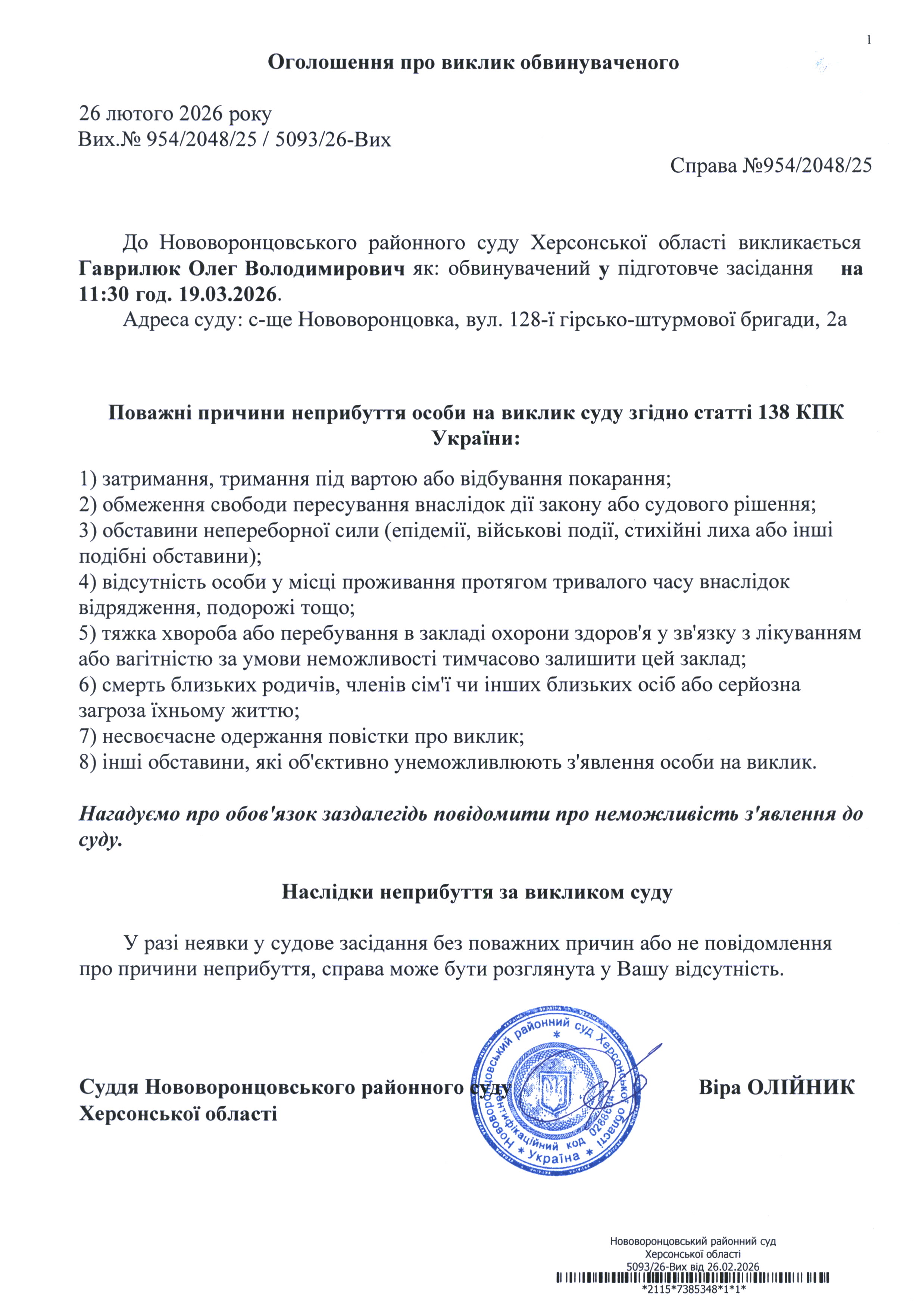 До суду викликається Гаврилюк Олег Володимирович на 11 год. 30 хв. 19 березня 2026 року