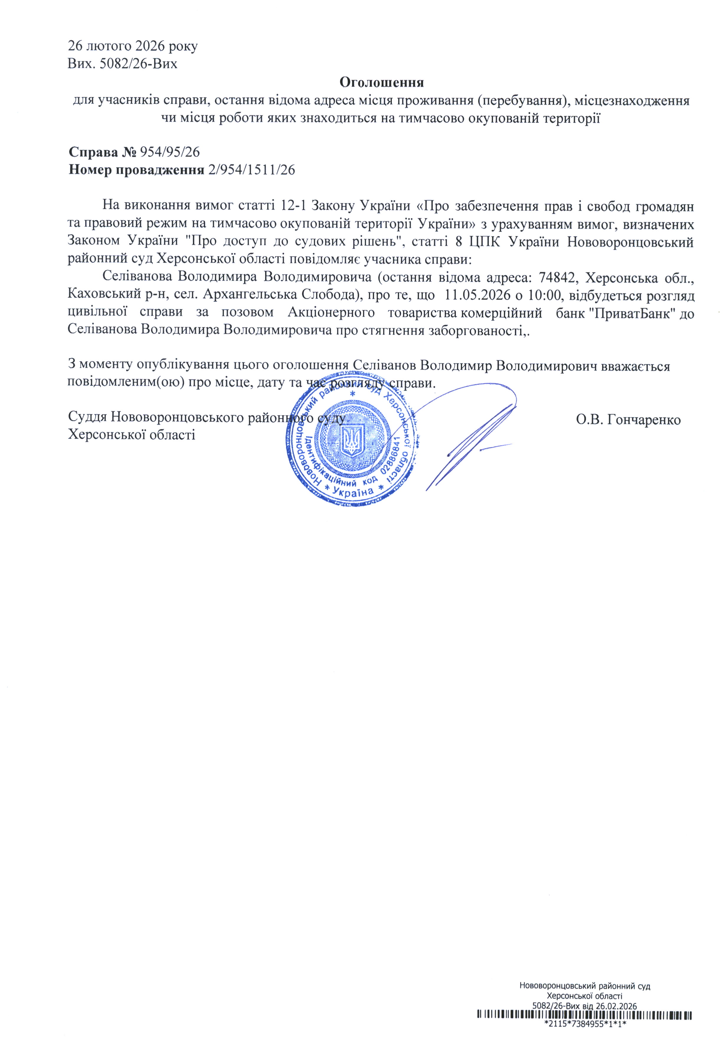 До суду викликається Селіванов Володимир Володимирович на 10 год. 00 хв. 11 травня 2026 року
