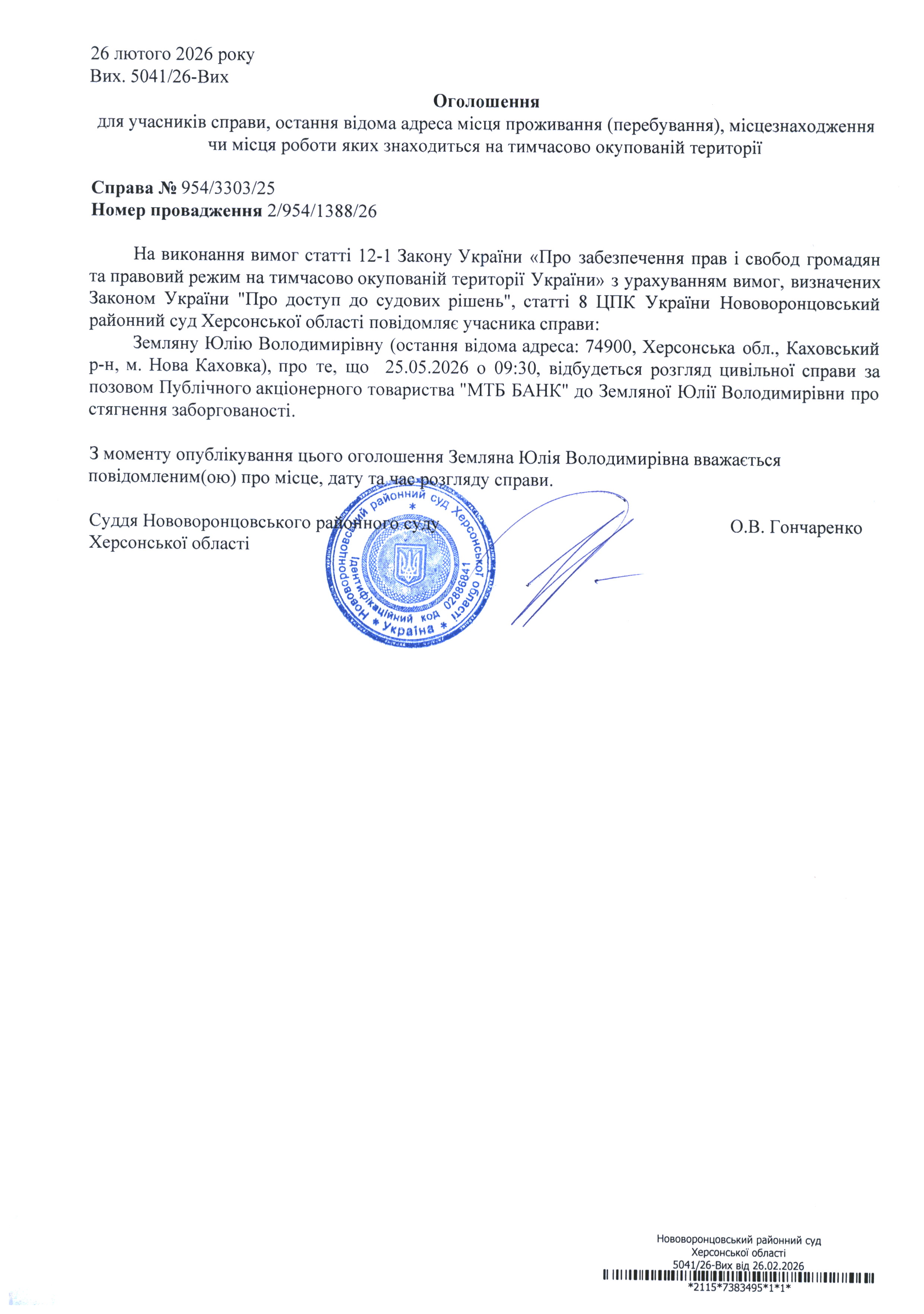 До суду викликається Земляна Юлія Володимирівна на 9 год. 30 хв. 25 травня 2026 року