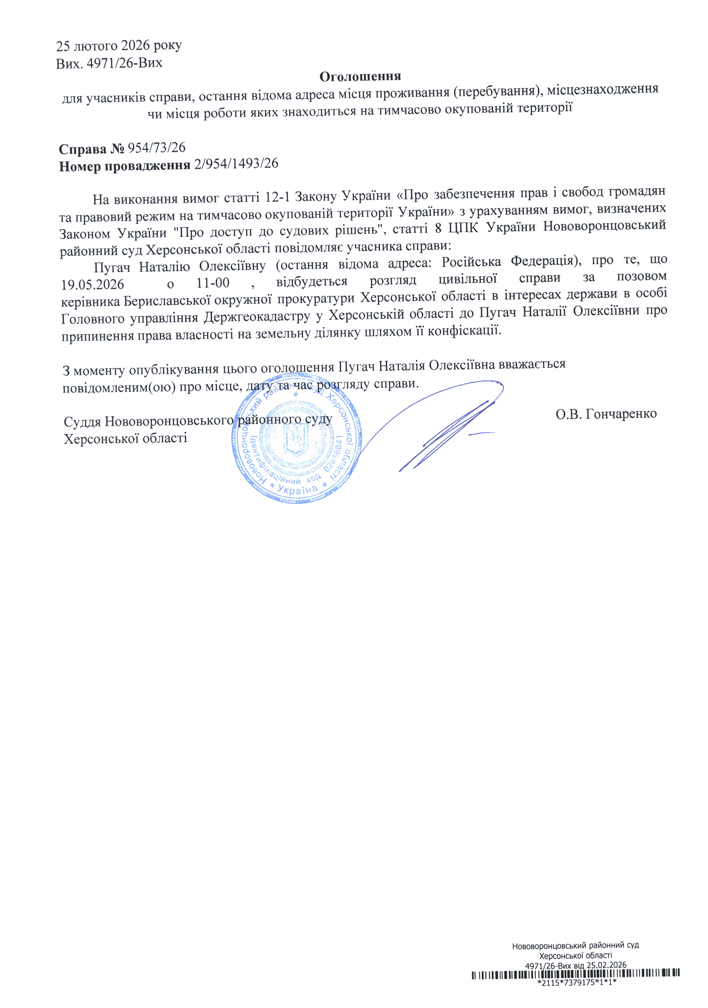 До суду викликається Пугач Наталія Олексіївна на 11 год. 00 хв. 19 травня 2026 року